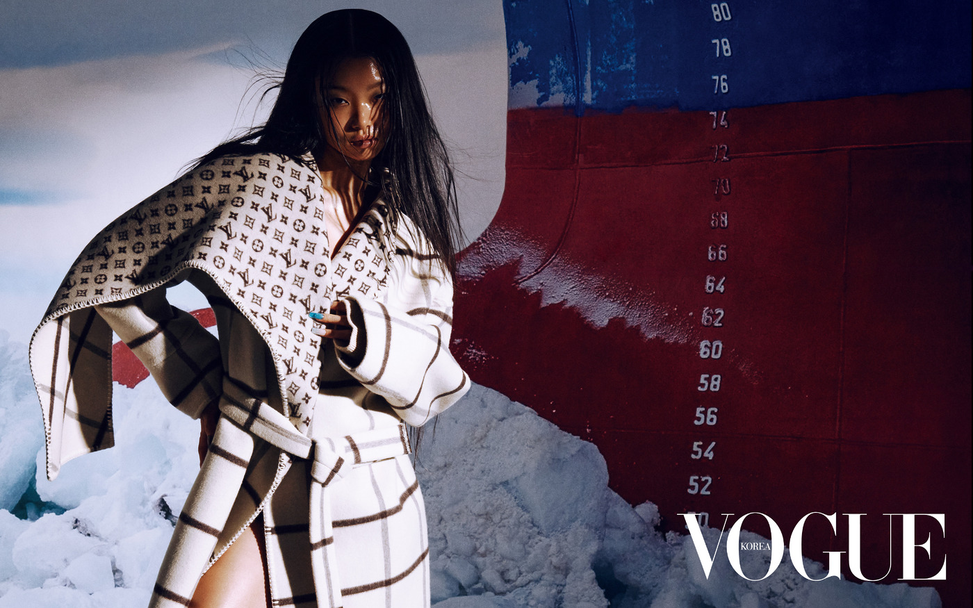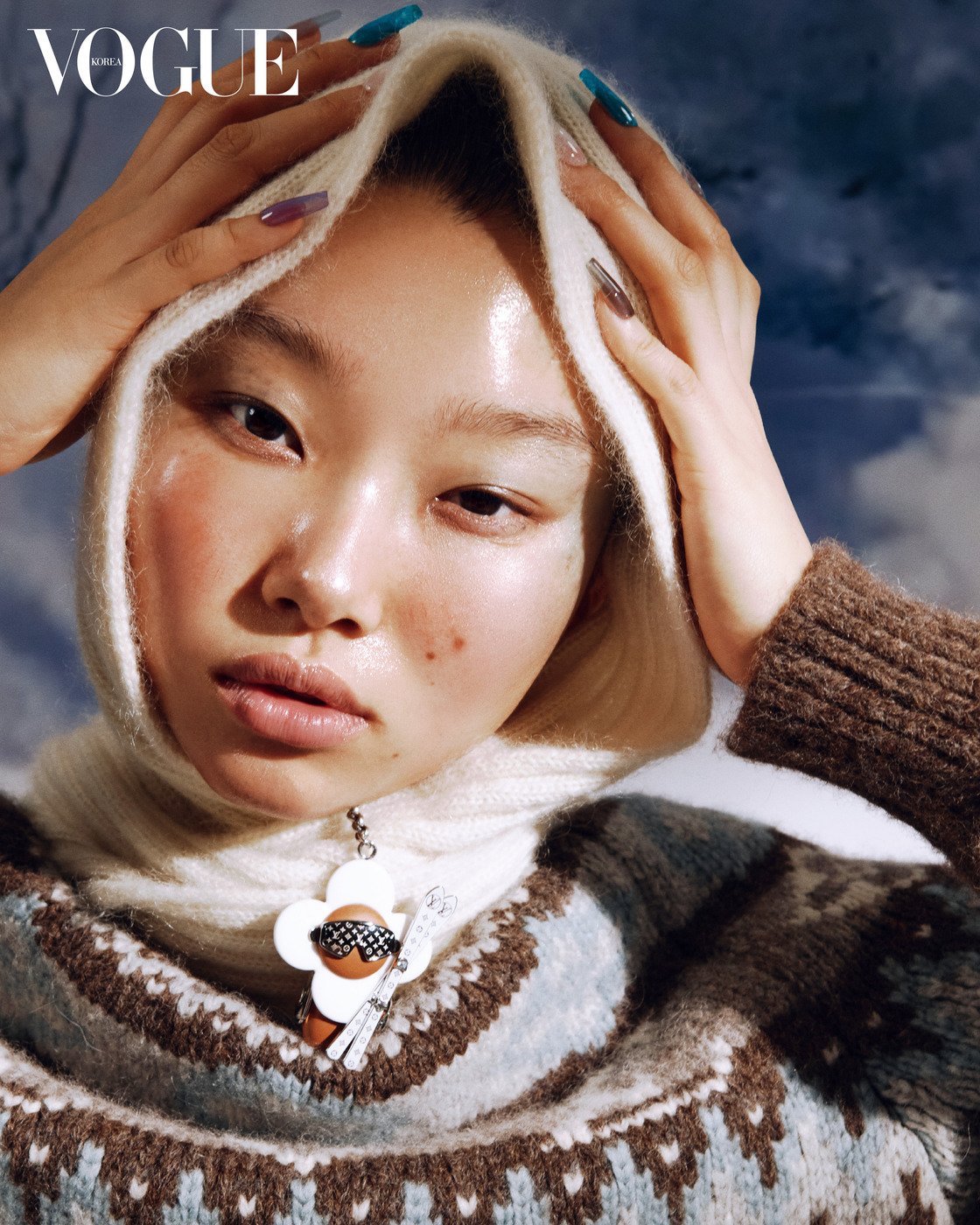 Shine Bright 페어 아일 스웨터와 머플러의 만남. 의상은 루이 비통(Louis Vuitton).
