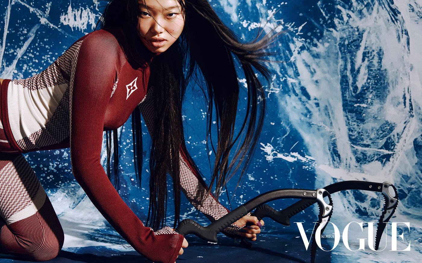Glacier Glory 모노그램 패턴의 버건디 컬러 보디수트는 스키 탈 때 특히 멋스럽다.