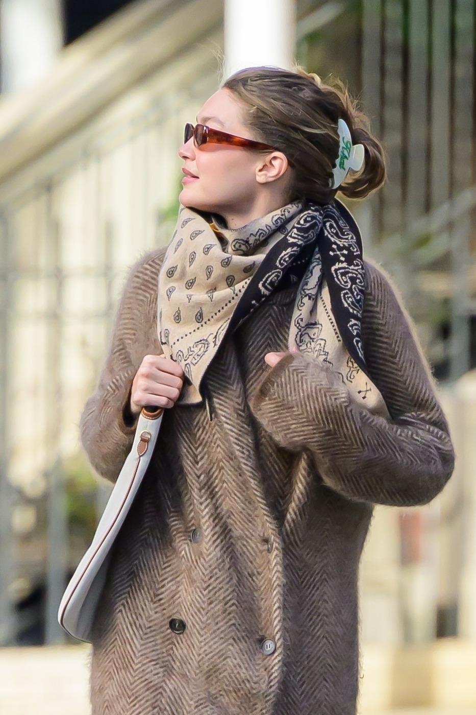올겨울 스타일링의 핵심 아이템으로 부상한 스카프 역시 눈에 띕니다. 모헤어 스카프와 스키니 스카프 등 ‘평범하지 않은’ 아이템이 패션 피플의 사랑을 받고 있는 와중, 지지 하디드는 2000년대에 짧은 전성기를 누렸던 ‘네커치프(Neckerchief)’를 선택했습니다. 올해 초, 티모시가 종종 착용했던 맥퀸의 스컬 스카프가 떠오르기도 했죠. 트렌드를 수용하되, 이를 살짝 비틀어 자신만의 방식으로 활용하는 지지 하디드의 센스를 확인할 수 있죠?