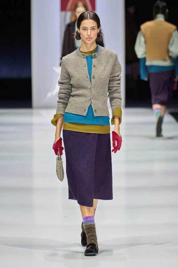 라운드넥 스웨터의 매력은 미우미우와 스키아파렐리가 뚜렷하게 보여줍니다. 미우미우는 캐시미어를 일상적이고 가볍게 표현했죠. 덕분에 스커트와 함께 입었을 때 자연스럽고 도시적인 느낌을 자아냅니다. 스키아파렐리는 반대로 파워풀한 느낌으로 캐시미어 스웨터를 해석했죠. 두 브랜드는 정반대의 언어를 사용했지만, 결국 스웨터가 ‘현대적인 우아함’을 상징한다는 것을 증명했습니다.