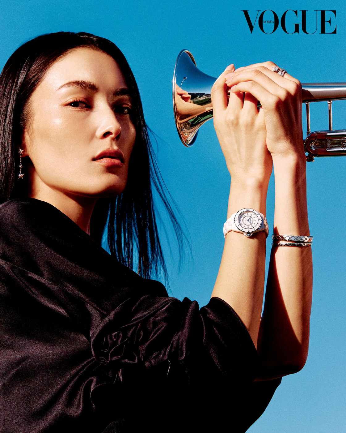 Sound System 화이트 세라믹과 스틸, 다이아몬드 인디케이터를 더한 33mm 크기의 ‘J12 워치 칼리버 12.2’. 18K 화이트 골드에 다이아몬드를 장식한 ‘꼬메뜨’ 귀고리와 반지, ‘코코 크러쉬’ 팔찌.