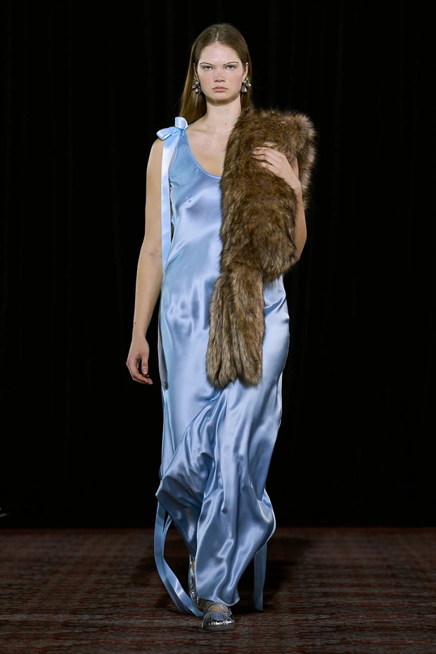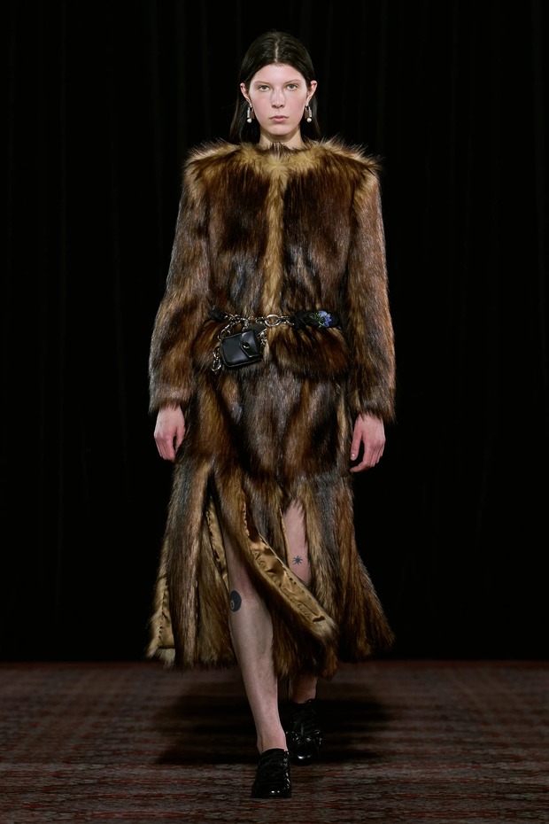 앨런은 달콤한 것이 약간 시큼해졌다고 표현하면서, 어거스트 배런과 시몬 로샤를 떠올렸죠. 미적으로나 정신적으로 베루카의 비뚤어진 에너지는 어거스트 배런의 목이 돌아간 카디건과 빛바랜 꽃무늬 스커트 스타일링과 일맥상통한다고요. 시몬 로샤의 2025 가을/겨울 쇼에서 선보인 모피 아이템처럼 잔혹 동화 같은 면모가 강조됐다고 소개했죠.