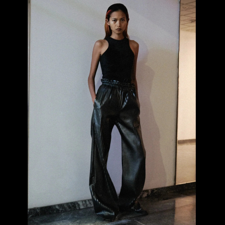 여기서 가장 많이 듣는 질문. “이걸 나도 착용할 수 있을까?” 그다음으로 많이 듣는 질문은 “도대체 어떤 신발과 어울릴까?”입니다. 발목에서 끊기는 크롭트 길이는 그만큼 볼드한 슈즈를 돋보이게 해요. 그래서 과감한 힐이나 슬림한 플랫 등 보여주고 싶은 신발을 신을 때 좋죠. 반대로 발등을 살짝 덮는 길이는 선이 자연스럽게 흘러내려 의도적인 오버사이즈 실루엣을 연출할 수 있어요. 밑단이 신발 위에 가볍게 얹힐 때, 편안한 무드가 더 살아납니다.