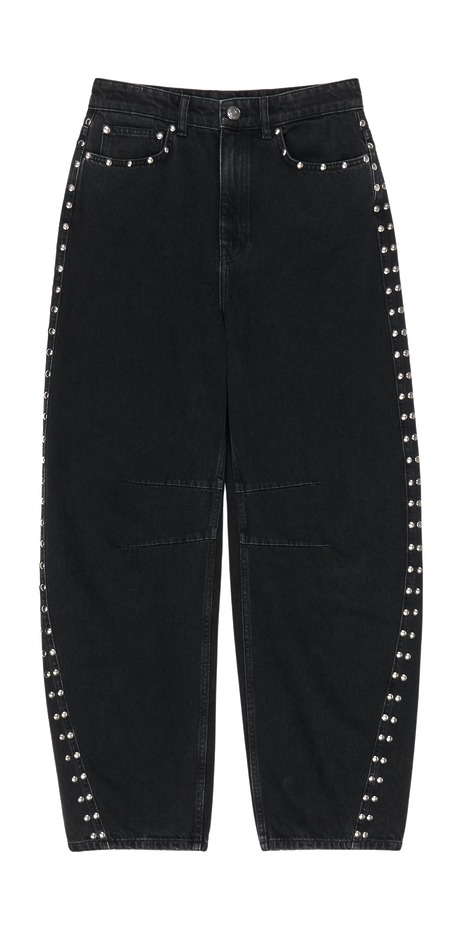 배럴 레그의 굴곡 있는 볼륨은 움직일 때마다 드라마틱한 라인을 만들어내는데요. 이미 실루엣만으로도 충분히 과감하다 할 수 있는 배럴 진에 미세하게 반짝이는 스터드 장식이 더해지면 어떨까요? 포멀하고 미니멀한 스타일링과 함께라면 주연급으로 격상됩니다. 나머지는 무조건 날렵하게, 정제된 모드여야 해요.