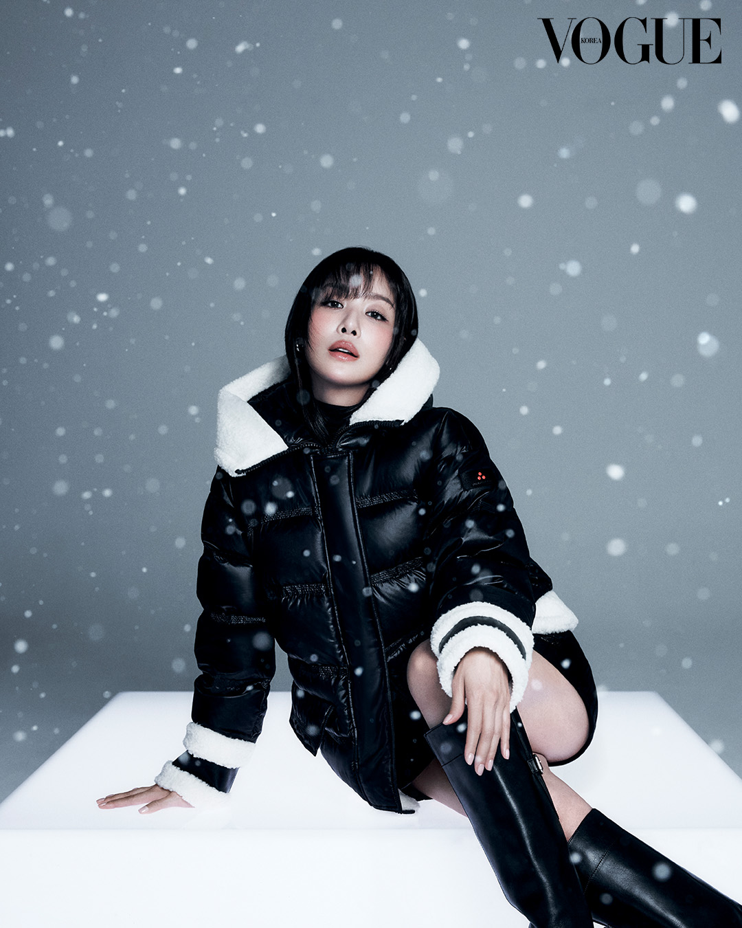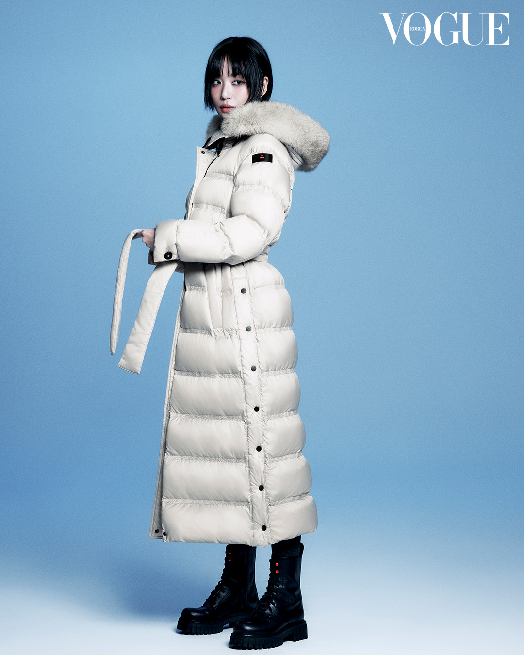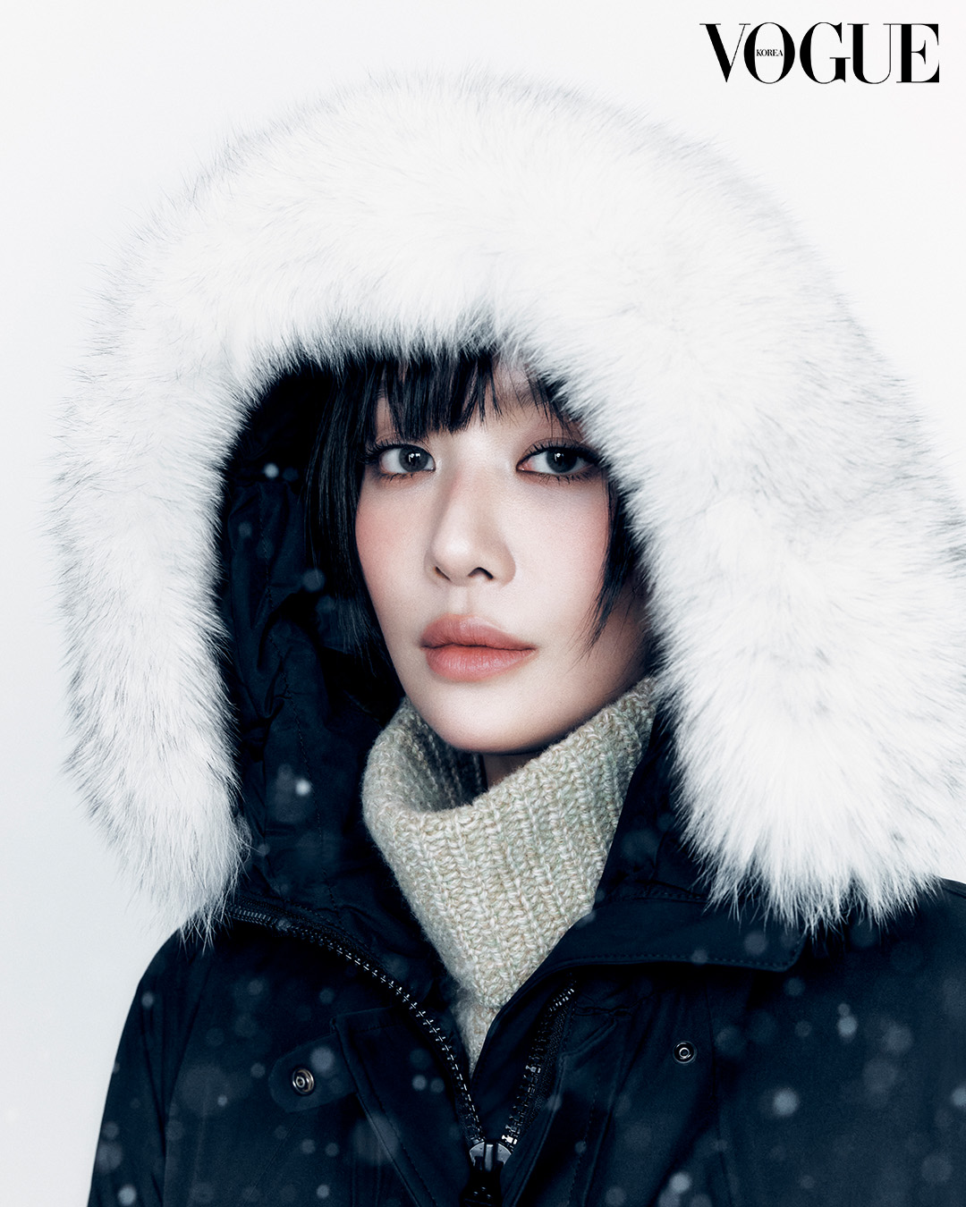 내추럴 퍼를 활용한 나샤 패딩과 은은한 멜란지 컬러가 세련된 무드를 자아내는 마그리테 니트는 페트레이(PEUTEREY).