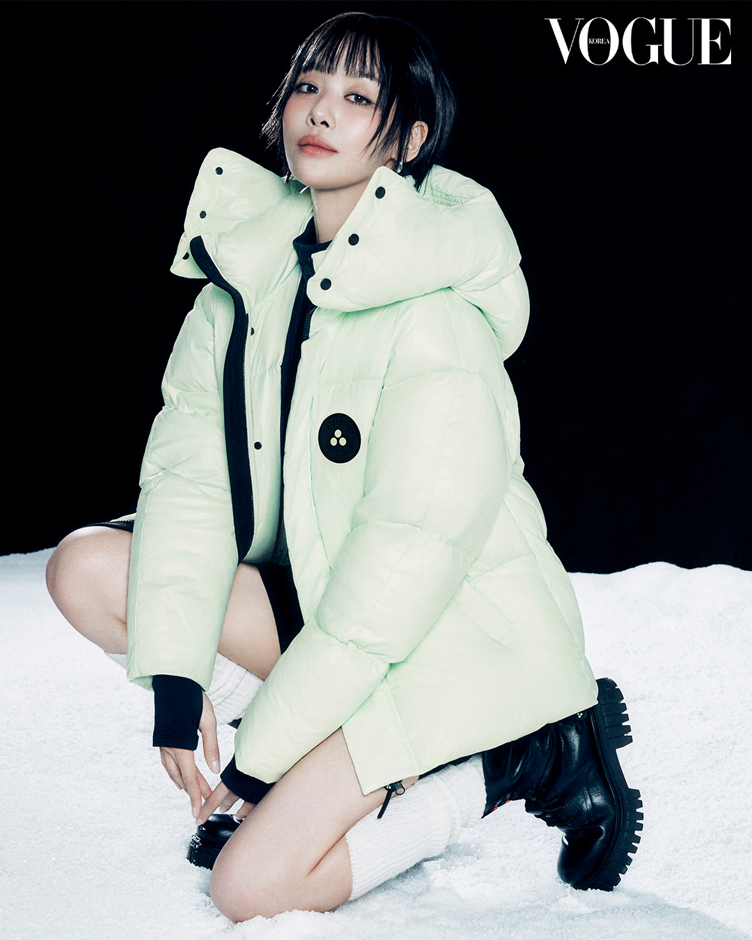 강렬한 민트 컬러의 떠거 패딩과 발목을 편안하게 감싸 착화감이 우수한 스웨프트 워커는 페트레이(PEUTEREY).
