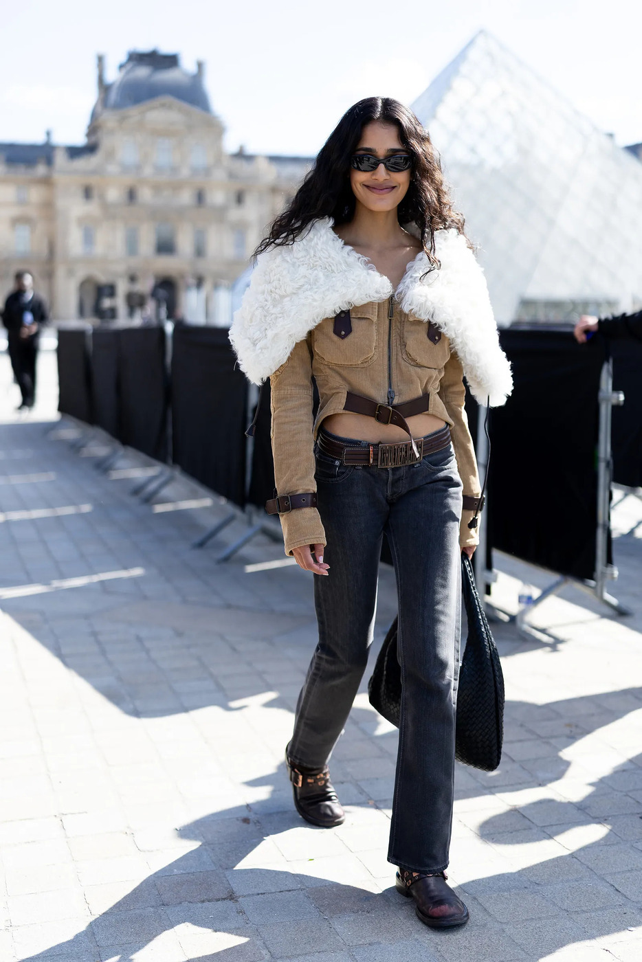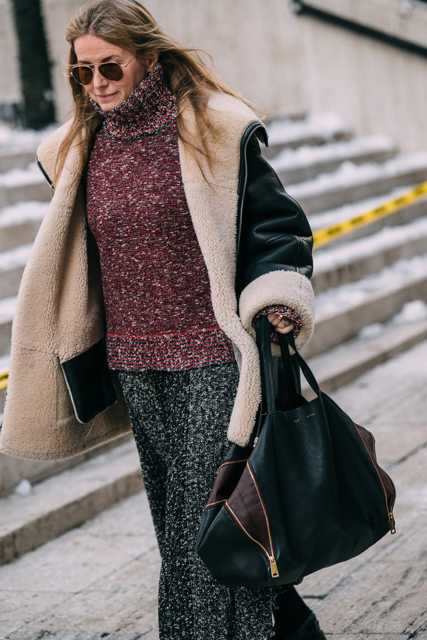 올해 모피 재킷의 핵심이 짧은 길이와 어딘가 꾀죄죄한 분위기라고 했죠. 시어링 재킷을 입을 때도 마찬가지입니다. 길이는 엉덩이 위에서 끝나는 디자인으로, 청바지와 매치한다면 양털 특유의 은근한 반항기를 부각할 수 있죠. 신발은 가죽 소재 플랫 슈즈나 부츠를 취향껏 고르면 됩니다.