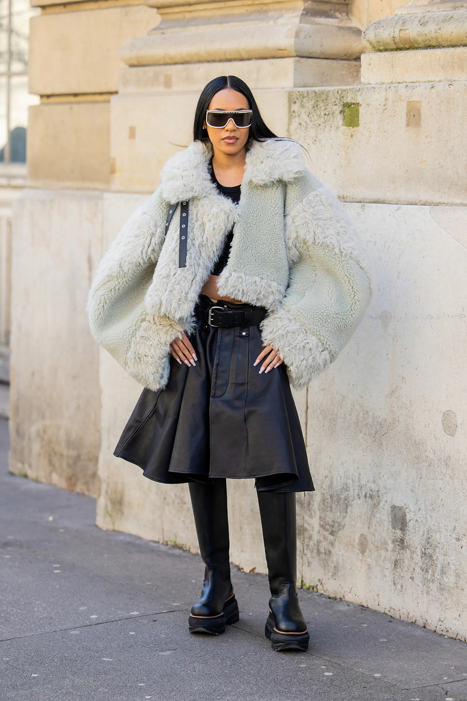 품이 넉넉한 시어링 재킷은 섬세한 레이스 장식이 달린 드레스나 스커트와 조합해봅시다. 각기 양극단의 무드를 자아내는 아이템인 만큼, 손쉽게 믹스 매치를 연출할 수 있을 거예요. 다리가 허전하게 느껴진다면, 롱 부츠나 타이츠를 신는 것은 필수입니다.