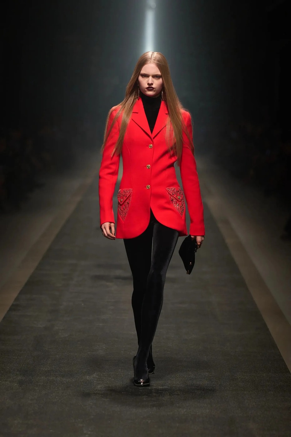 베르사체는 2025 가을/겨울 시즌 런웨이를 통해 레깅스로 구현할 수 있는 가장 화려한 룩을 선보였습니다. 일반적으로 ‘화려한’이라는 단어에서 떠올리곤 하는 가죽이나 메시 대신, 따뜻한 느낌을 주는 벨벳 소재의 검은색 레깅스를 활용했죠. 여기에 펌프스를 더해 다리가 길어 보이는 효과를 줬고요. 상의로는 터틀넥 블라우스와 맞춤 제작한 빨간색 블레이저를 선택했습니다. 색감 대비와 실루엣이 어우러져 1980년대 감성이 느껴지는 화려한 레트로 룩이 완성되었군요.