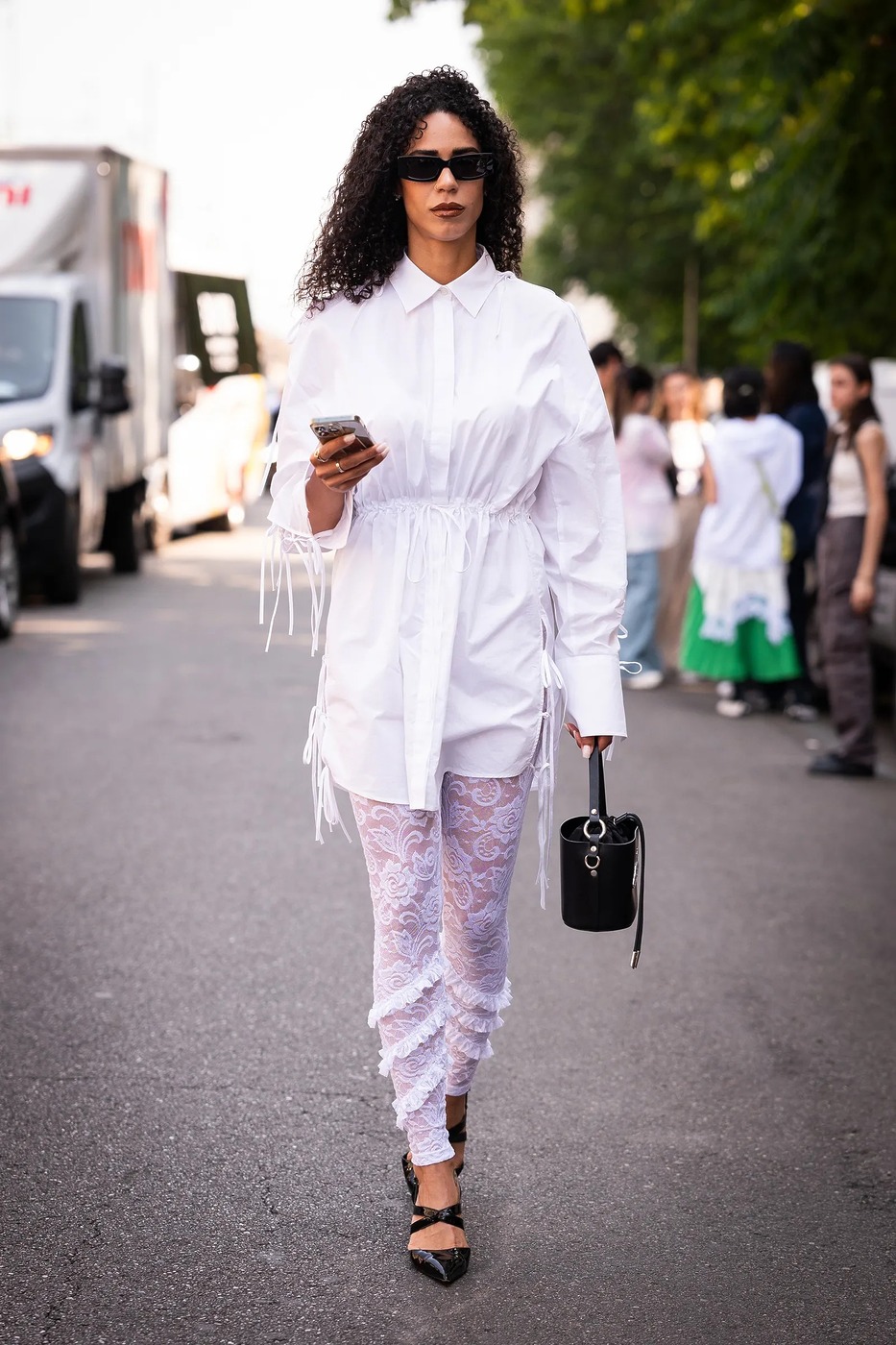 실험적인 스타일을 선호하는 새로운 세대를 위한 레깅스 룩입니다. 하얀 레이스 레깅스와 키튼 힐의 조합이 눈에 띄죠. 매력적이면서도 우아한 느낌을 줘, 특별한 날에 어울립니다. 오버사이즈 핏의 화이트 셔츠와 매치하면 로맨틱한 무드를 더해줄 수 있습니다. 순수하고 섬세한 여성성을 표현한 코케트코어 감성도 한 스푼 담겨 있죠!