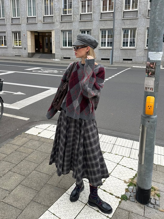 플레어 핏 롱 체크 스커트 + 아가일 니트 + 재킷