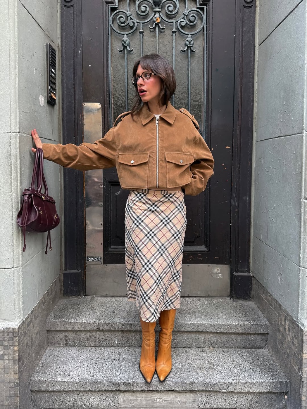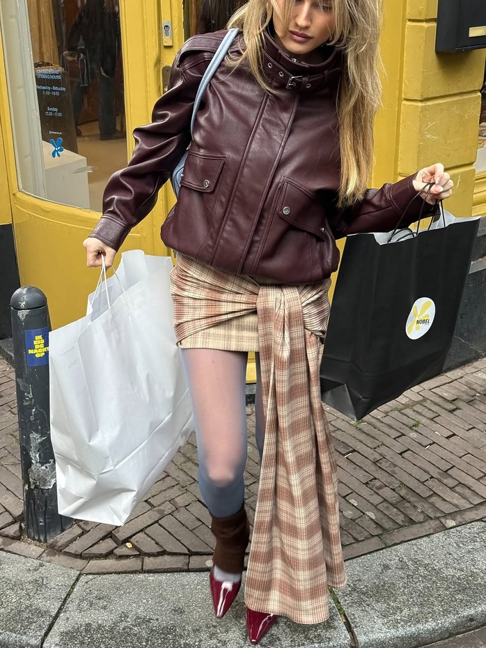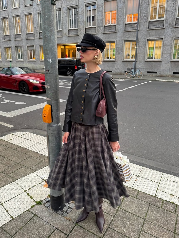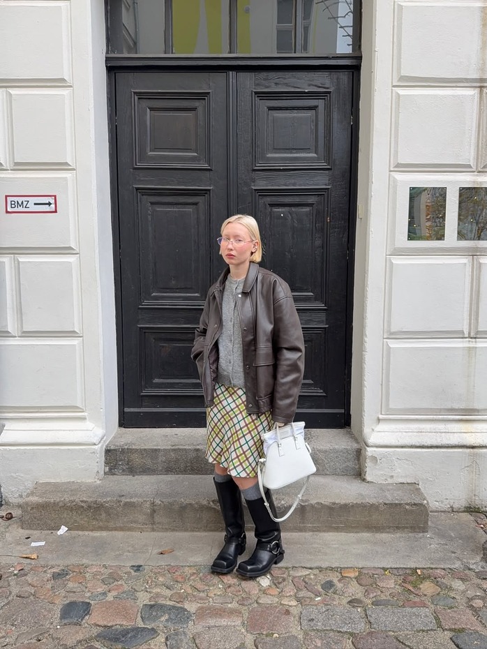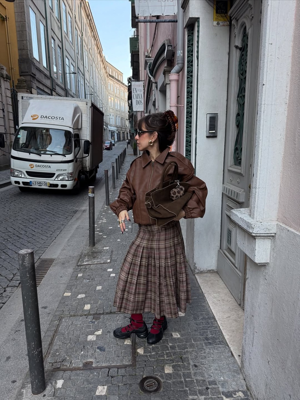 어떤 길이나 디자인의 체크무늬 스커트든 대동단결하게 해주는 아우터가 바로 레더 재킷입니다. 강렬한 에너지를 지닌 레더 재킷과 클래식한 체크는 올겨울 필수 조합이죠. 레더 재킷은 브라운 컬러가 가장 좋아요. 블랙이라면 자칫 차갑거나 둔탁해 보일 수 있는데, 브라운 레더 재킷은 따뜻한 감성을 풍기면서도 체크무늬의 빈티지한 느낌을 자연스럽게 살려주거든요.