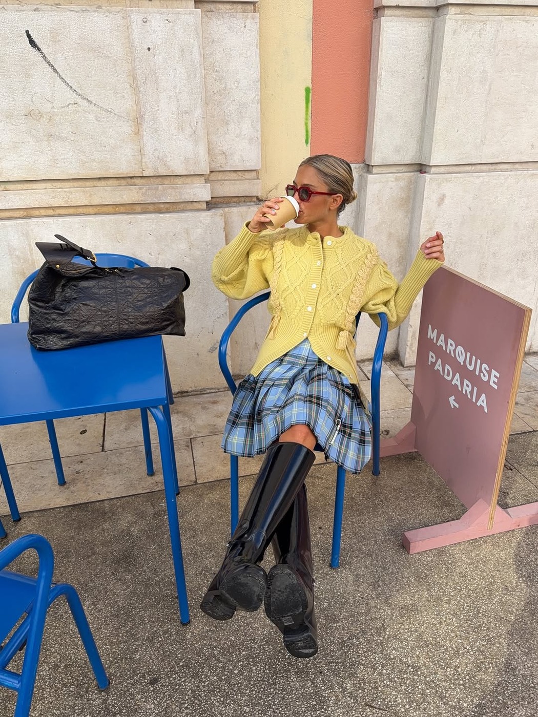 겨울이라고 체크무늬를 그레이, 브라운 무드로 무난하게만 입을 필요는 없어요. 쿨한 블루 톤 플리츠스커트에 파스텔 옐로 스웨터나 카디건을 매치하면 날씨가 무색해질 만큼 화사한 스타일링이 가능합니다. 컬러 조합에서 오는 지나친 달달함은 안정감 있는 블랙 니 하이 부츠와 가방으로 조절해주면 되죠.