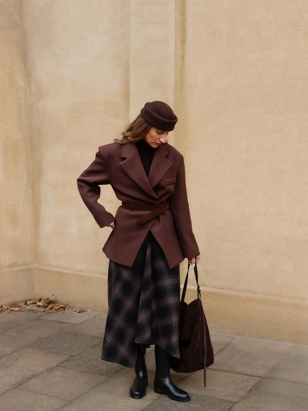 체크무늬도 얼마든지 우아해질 수 있습니다. 직선적인 테일러드 재킷과 단정한 터틀넥 니트, 그리고 역시 톤온톤으로 매끄럽게 이어지는 스커트는 체크를 가장 품위 있게 만들어주는 연출이에요. 이때 요크 디테일이나 바이어스 컷 실루엣이라면 구조적인 멋을 더할 수 있죠. 스커트를 제외하고는 미니멀 무드를 유지해주세요.