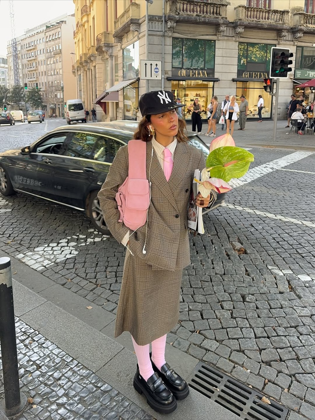 할머니 수트 같은 체크 스커트 셋업에 핑크 포인트를 더하면 심심할 일이 절대 없습니다. 양말부터 타이, 가방까지 핑크로 통일하니 한 발짝도 물러날 틈이 없죠. 뭉툭한 로퍼에 볼캡까지 쓰면 가장 힙한 스트리트 키드가 됩니다. 이 모든 걸 가능하게 한 건, 다름 아닌 체크무늬라는 사실이 놀랍죠?
