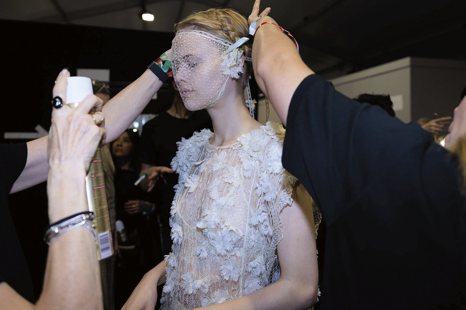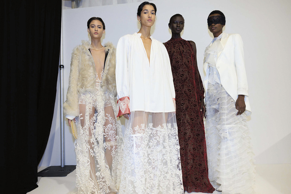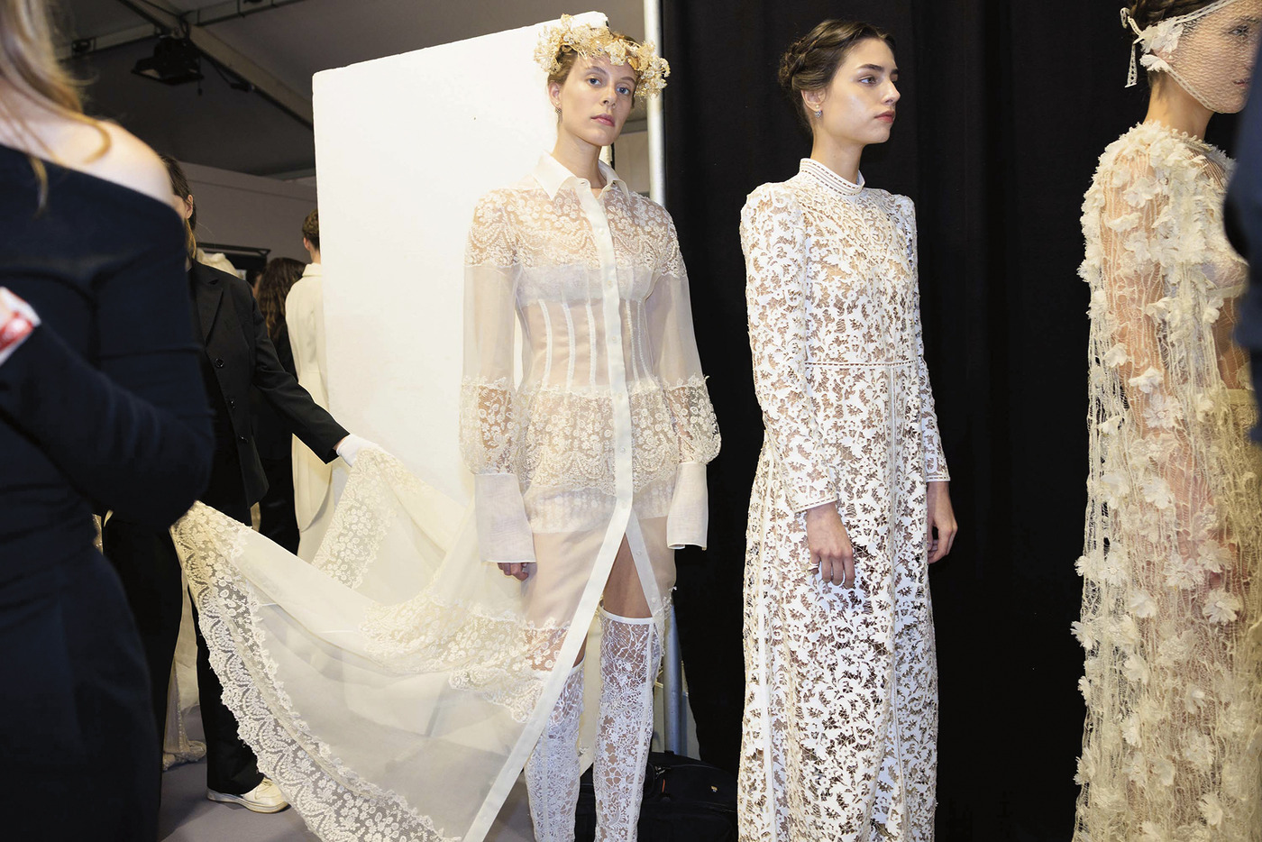 쇼의 시작은 길고 날씬한 실루엣의 더블 페이스 캐시미어 룩 네 벌이었다. 그중 하나는 팬츠 수트와 테일코트였다. “이건 오뜨 꾸뛰르예요”라고 마리아 그라치아가 말했다. “이런 옷은 손으로만 만들 수 있어요. 가장 단순한 것들이 때로는 가장 만들기 어렵죠.” 이 절제된 미니멀리즘의 풍요로움은 곧 이어진 반투명한 드레스로 확장되었다. 레이스 디테일만 해도 셀 수 없었다. 입체적인 꽃 장식, 잔물결 같은 러플, 잎사귀 모양 컷아웃, 물결무늬 아르데코 장식, 금빛 프린지로 덮인 격자무늬 등. 속옷은 살갗을 드러냈고 신발은 모두 플랫이었다.