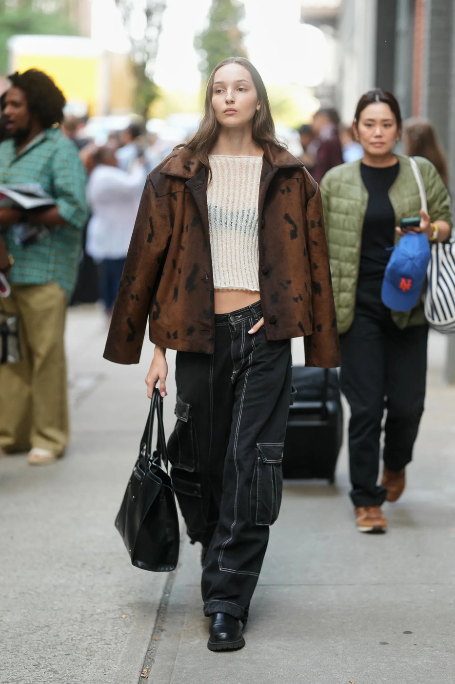Y2K 무드는 계속 레벨 업 중입니다. 루스한 로우 라이즈, 커다란 포켓 디테일은 그대로지만 미니멀하고 톤 다운된 색감으로 고급스럽게 가는 게 요즘 방식이에요. 화이트 톱(로고 장식이나 컬러 프린트는 없는!), 브라운 레더 재킷, 컴뱃 부츠로 마무리하면 되죠. ‘톤온톤’의 조화를 꼭 기억해두시고요.