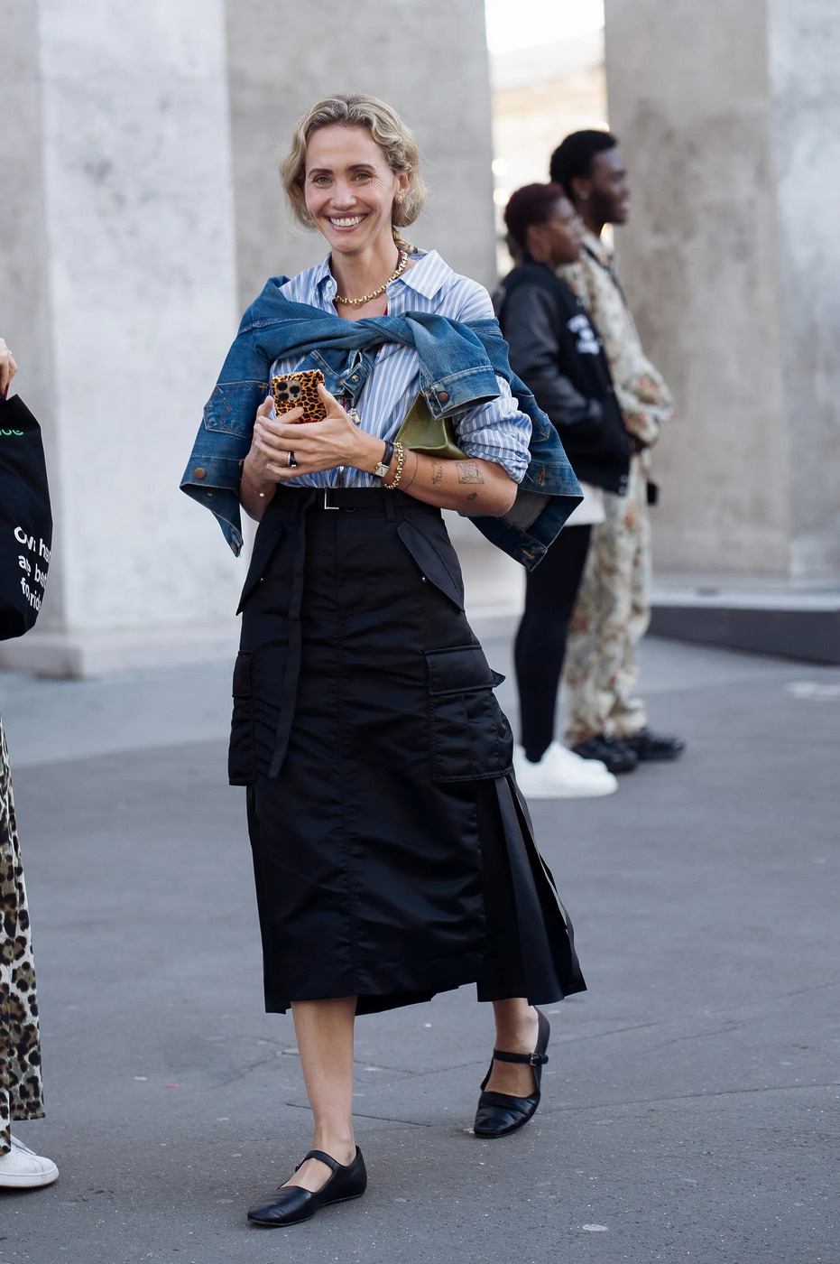 마지막으로 이번 시즌 다크호스처럼 떠오른 스타일링인데요. 스트레이트 실루엣의 미디스커트에 사이드 포켓이 더해지니 분명 카고 스커트인데도 우아한 분위기가 잔잔하게 깔리죠. 셔츠에 골드 주얼리를 약간 더하고, 발레 플랫이나 메리 제인 슈즈로 단아하게 마무리하세요.