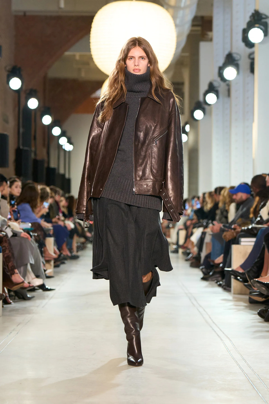마이클 코어스는 훨씬 차분한 방식을 택했습니다. 프라다나 미우미우 특유의 ‘신비로운 사서’ 이미지에서 벗어나 도회적인 글램 룩으로 변신시켰달까요. 무릎 아래로 흐르듯 찰랑이는 비대칭 스커트에 박시한 터틀넥 스웨터, 하이힐 부츠, 라이더 재킷을 매칭한 성숙한 무드죠.