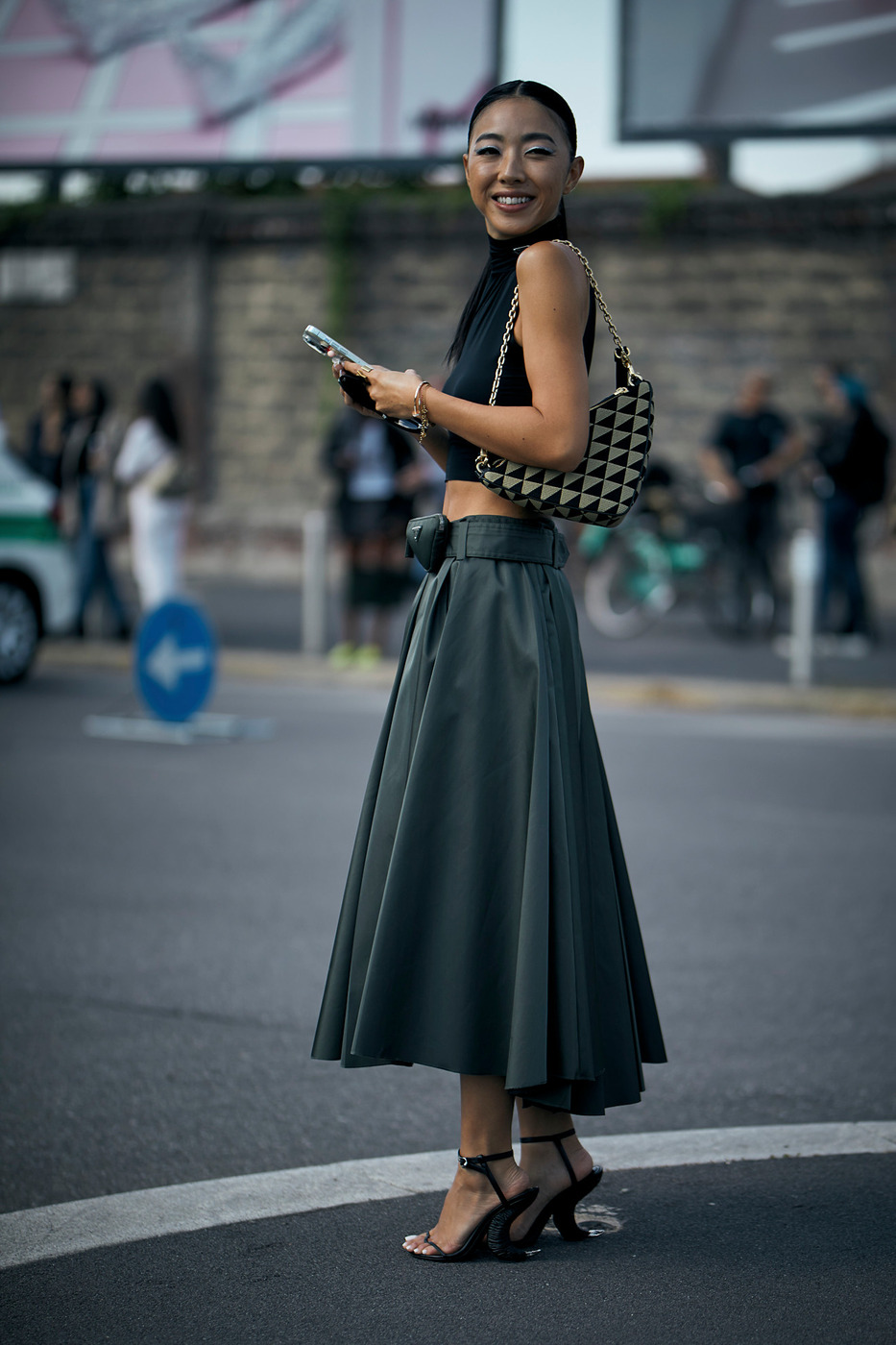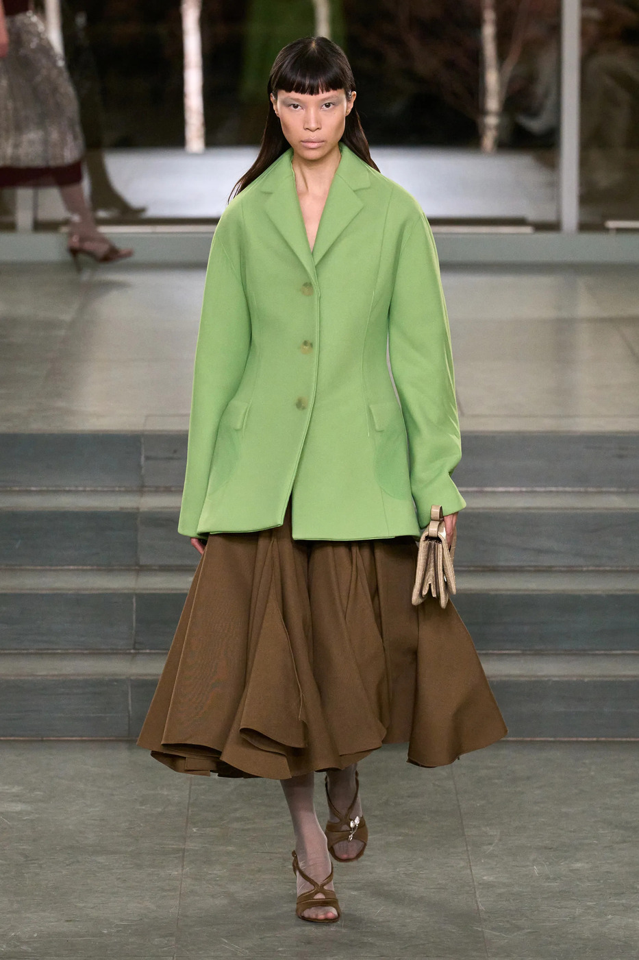 토리 버치는 풍성한 A 라인 같은 우아한 실루엣으로 미디 길이 테이블 스커트를 완전히 재해석했습니다. 테이블 스커트의 네모진 느낌을 걷어내니 한층 부드럽고 드레시해 보이는데요. 브라운 톤 스커트에 민트색의 구조적인 블레이저, 은은한 컬러의 스타킹, 그리고 브라운 오픈 토 샌들까지 매치하니 딱 1950년대 디바의 2025년 업그레이드 버전이 됐죠.
