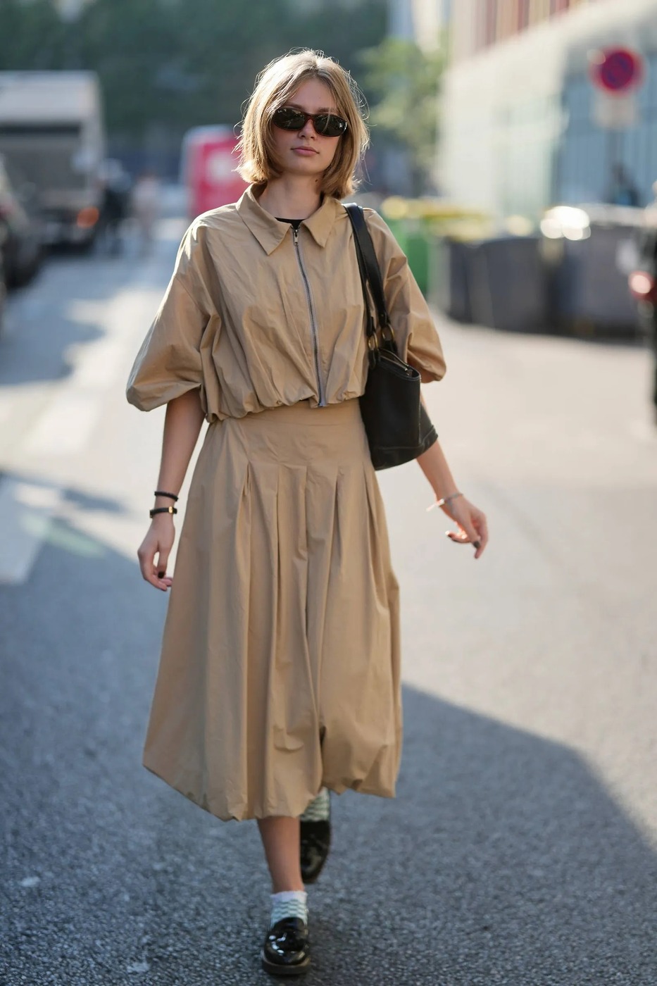 스트리트 스타일도 미디 테이블 스커트에 한 표를 던졌습니다. 약간 도톰한 방수 소재 느낌의 베이지 스커트를 크롭트 재킷과 셋업으로 입으면 전혀 애쓰지 않은 듯 자연스러운 룩이 완성돼요. 여기에 태슬 장식 로퍼와 하얀 양말을 신으면 기존의 교복 느낌을 살짝 비틀어 새롭게 스타일링할 수 있습니다.