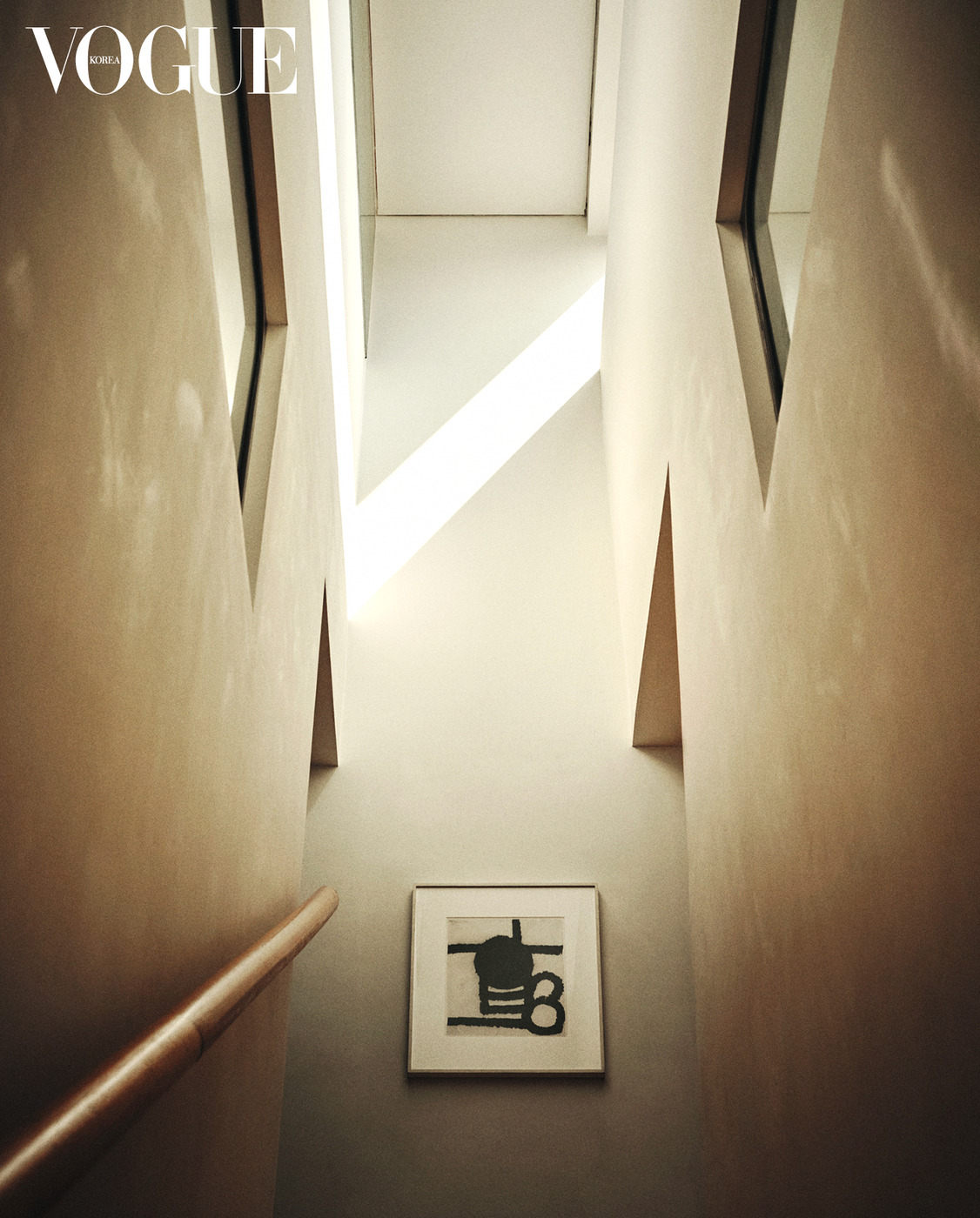 “1층으로 들어오면 왼쪽에 다이닝 룸이 있고, 오른쪽에는 작업실이 있어요. 식탁과 소파가 있는 다이닝 룸은 유럽 시골의 작은 집 같다고 다들 말씀하십니다. 1층 작업실은 3층에서 그린 작품을 설치해놓고 전시를 미리 시뮬레이션하는 용도로 주로 사용합니다.” 다이닝 룸에는 김 작가의 초기 작품과 남편의 직업을 짐작하게 하는 피아노, 턴테이블이 놓여 있다. 1층에서 눈에 띄는 그림은 그녀가 30년 전 베를린 유학 시절 낳은 큰아들을 산부인과에서 안고 있는 자화상과 두 아들의 어린 시절을 그린 수묵화다. 요즘은 구상화를 그리지 않는 그녀이기에 가족애를 담은 초기 작품을 볼 수 있어서 반갑다. 한쪽의 벽난로는 겨울마다 사용하는 것으로, 거실이 따뜻하게 유지되는 한편 마시멜로와 고구마도 구워 먹을 수 있는 낭만적 아이템이다. 통창으로 햇살이 가득 들어오는데, 담장을 올리지 않는 헤이리의 특성을 고려해 작은 정원을 만들어 외부와 차단했다. 측백나무와 회화나무가 사시사철 푸른 정취를 자아낸다.