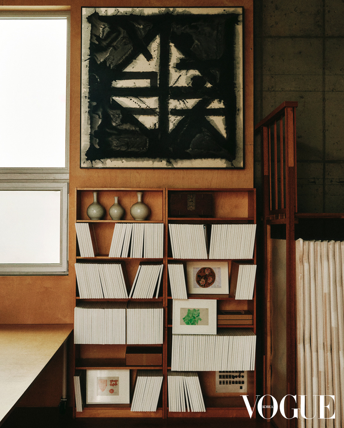 본격적인 커리어를 시작한 젊은 미술가와 건축가는 수십 번 사전 미팅을 하며 소통을 시작했다. 김 작가의 남편은 클래식 녹음 전문가였기에, 이 집 설계는 그야말로 예술의 각축전이 벌어지는 터전이었다. 처음에 1층은 김 작가의 작업실, 3층은 남편의 음향 녹음실로 만들었다. 그러다가 김 작가의 작품이 늘어나면서 남편이 작업실을 옮겨 이제는 3층도 그녀 차지다. “재테크에는 전혀 관심 없이 작품 활동만 해오다, 작가로서 큰 작업실이 꼭 필요하다고 느꼈지요. 서울 아파트를 팔고 대출받아서 작업실을 지은 것은 지금 돌아봐도 참 잘한 일이에요. 이곳에서 큰 작품을 마음껏 그리지 못했다면 나를 대표하는 대형 작품 연작 ‘반구대의 고래’ ‘훈민정음’ ‘예술과 암호’를 만들지 못했을 겁니다. 그런 의미에서 참 고마운 곳이지요.”