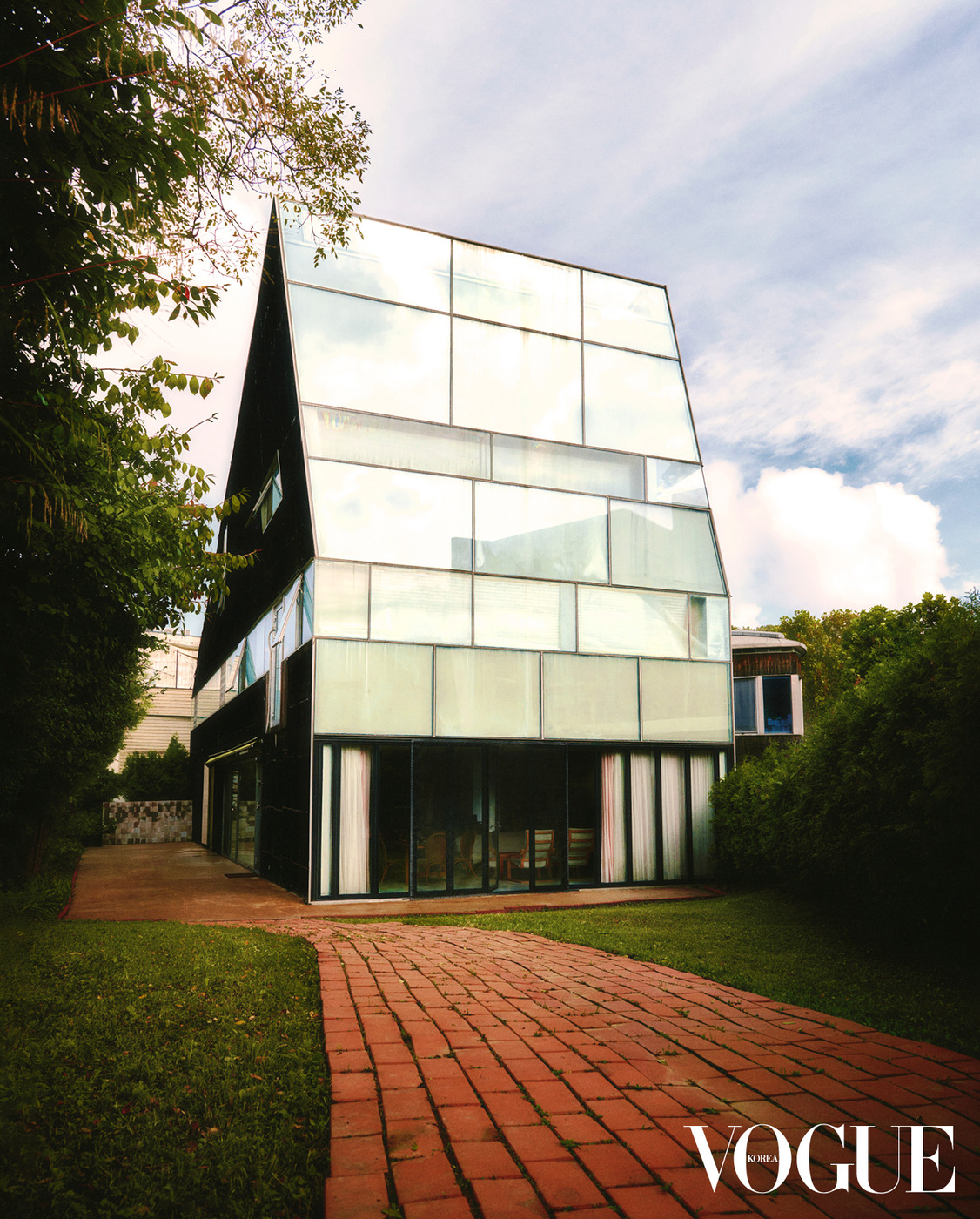1층 다이닝 룸의 창은 열리지 않는 통유리였는데, 환기를 위해 열리는 구조로 교체한 것이 김 작가는 아직도 미안하다. 시간이 지났어도 건축가의 의도를 100% 존중하고 싶은 따뜻한 마음에서다. “처음에 콘크리트 벽 외관에는 이끼를 가득 심었습니다. 이끼 정원 건물이었지요. 그때는 조 건축가도, 저도 젊었기에 색다른 건물로 완공하고 싶었거든요. 비용도 크게 들지 않았고요. 하지만 살다 보니 관리가 쉽지 않아서 지금은 당시 흔적만 남아 있습니다. 시들어가는 이끼를 바라보는 것도 아주 의미 있었어요. 게다가 이끼가 없어도 여전히 시크한 건물이니까 흡족합니다.”