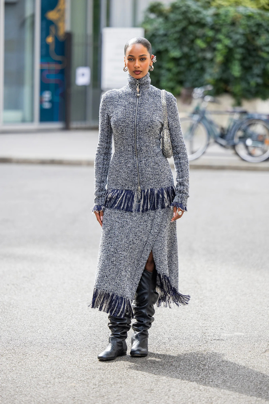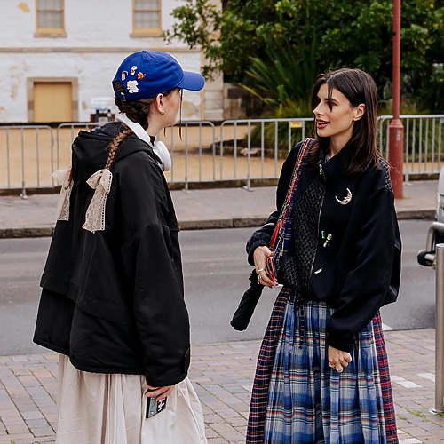 프린지가 조금 과하고 어렵게 느껴진다면 니트와 조합해보세요. 여기에 화이트 롱 슬리브 셔츠처럼 절제된 베이식 아이템을 레이어드해 균형을 잡으면, 눈에 띄는 스커트의 개성을 한껏 살리면서도 전체 룩은 차분해집니다. 집업 니트 톱을 셋업으로 매치하는 것도 스타일 고수들이 즐겨 하는 전략이에요.