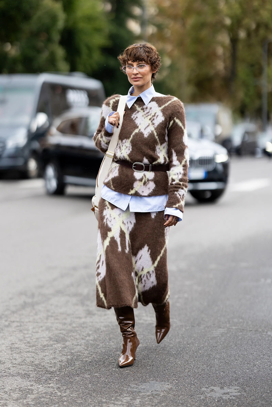 출근 룩도 이렇게 따뜻하고 스타일리시할 수 있습니다. 브라운, 화이트, 레몬 옐로의 조합은 겨울에 기분 좋은 활기를 더해주죠. 긴 스웨터와 패턴을 맞춘 미디스커트를 셋업으로 연출하고, 슬림한 벨트를 매는 방식은 사무실에서도 문제없을 만큼 단정합니다. 여기에 뾰족한 힐 부츠를 신으면 날렵한 멋이 더해져 그야말로 업무 능률까지 오를 것 같은 룩이 돼요.