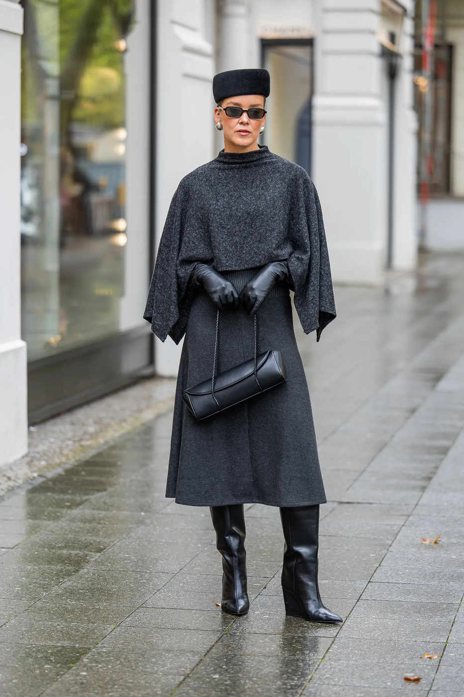 한 가지 컬러 톤으로도 충분히 압도적입니다. 여성스럽게 떨어지는 플리츠 미디스커트, 안정감 있는 웨지 부츠, 어깨 위를 부드럽게 덮는 짧은 케이프까지. 짙은 그레이로 통일한 룩은 특별한 일정이 있는 날에도 끄떡없는 절대적인 우아함을 발휘할 수 있어요.