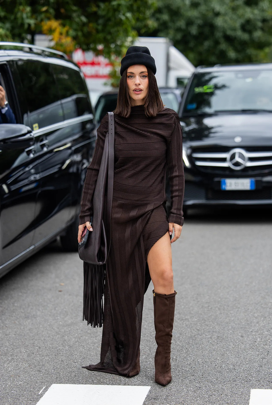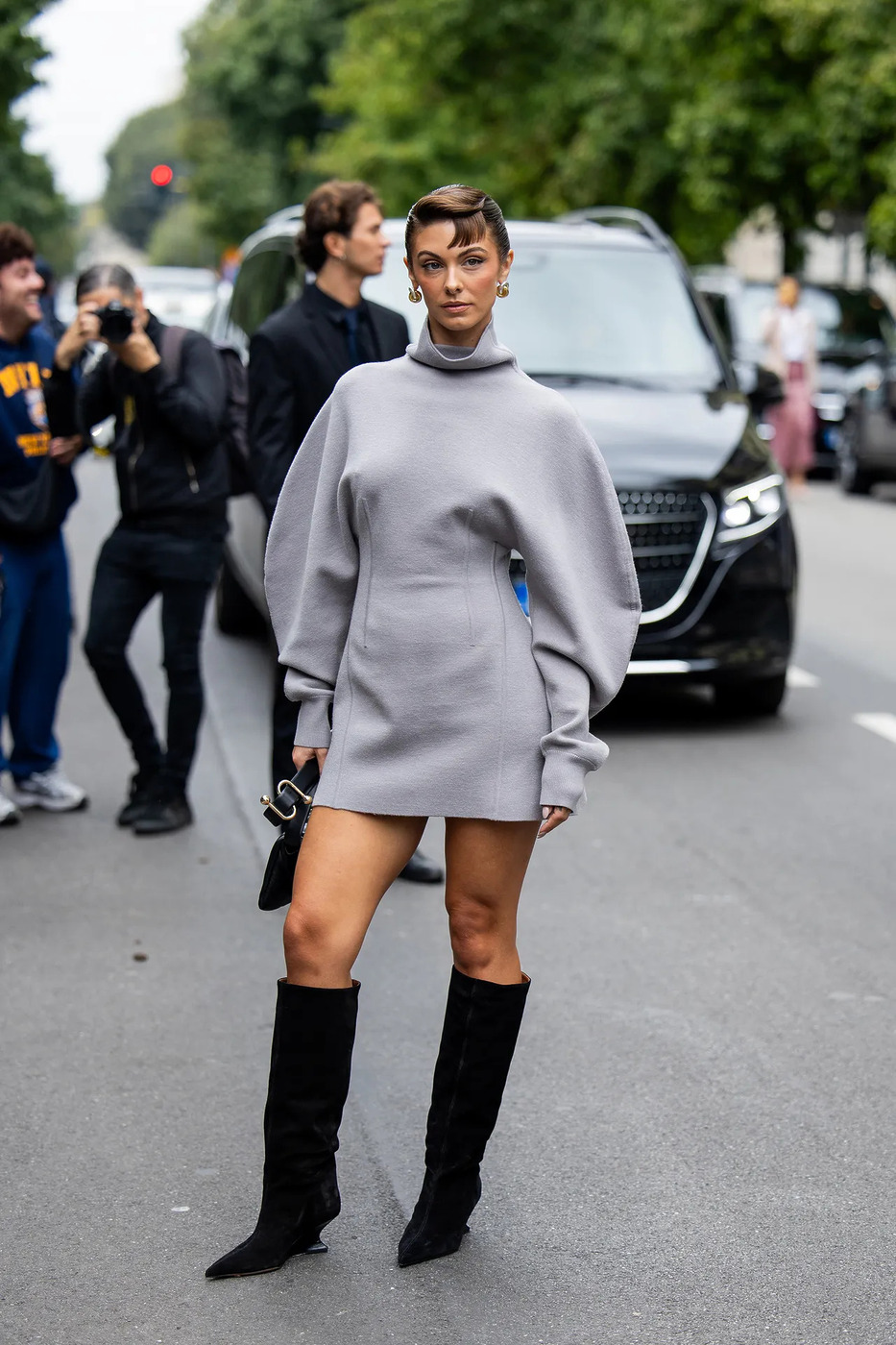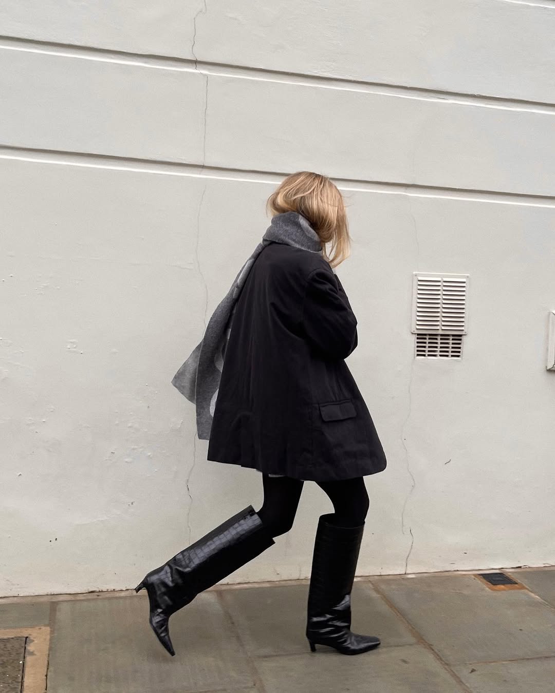 뭘 많이 걸치지 않아도 멋있는 ‘롱부츠에 미디 원피스’ 조합