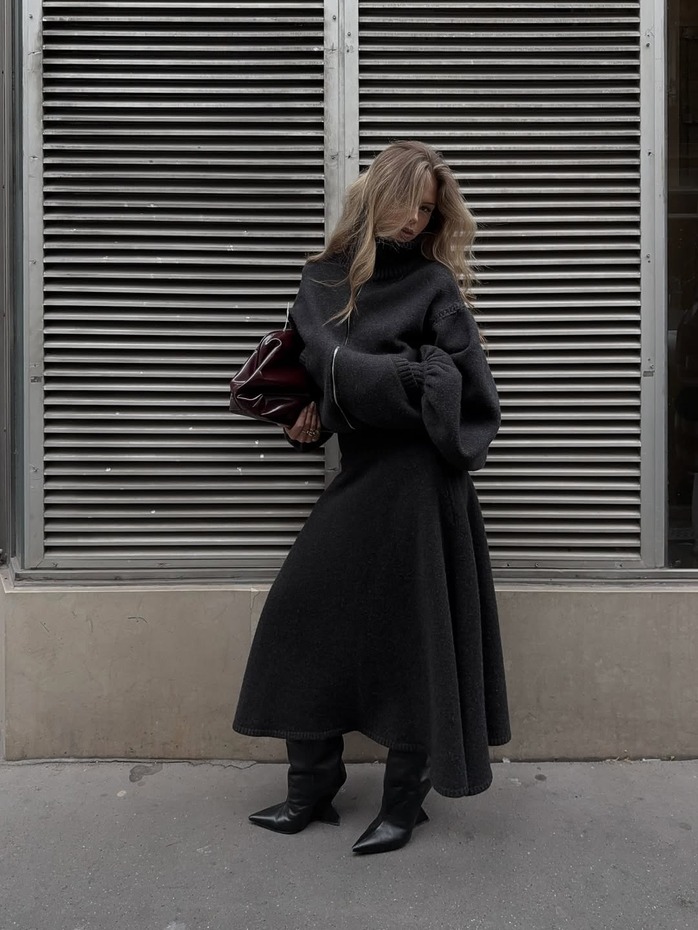 스커트도 빼놓을 수 없죠. 제가 제일 좋아하는 건 미디스커트에 롱부츠를 겹쳐 신는 건데요. 겨울에도 노출 하나 없이 따뜻하면서, 멋스러운 느낌을 내기 좋습니다. 이렇게 겹치는 연출을 할 때는 스커트와 부츠의 컬러를 달리해보세요. 블랙 스커트에 버건디 부츠를 조합한 것처럼요. 반면, 비대칭 스커트로 포인트를 주고 싶다면 한 가지 컬러로 통일해도 좋습니다.