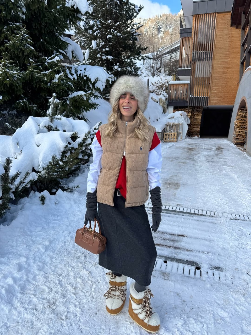 눈이 소복하게 쌓인 겨울 휴양지에서도 스커트는 유효합니다. 아침 스키를 마치고 점심을 먹으러 나갈 때 좋은 룩인데요. 따뜻한 베이지 다운 베스트와 레드 니트, 회색으로 맞춘 스커트와 장갑, 타이츠의 컬러 조합이 돋보이죠. 미디스커트와 문 부츠의 매치는 활동적이면서도 스키 리조트 특유의 포근함을 더해줍니다. 포인트 컬러 하나, 푹신한 텍스처 하나. 두 가지를 기억하세요.