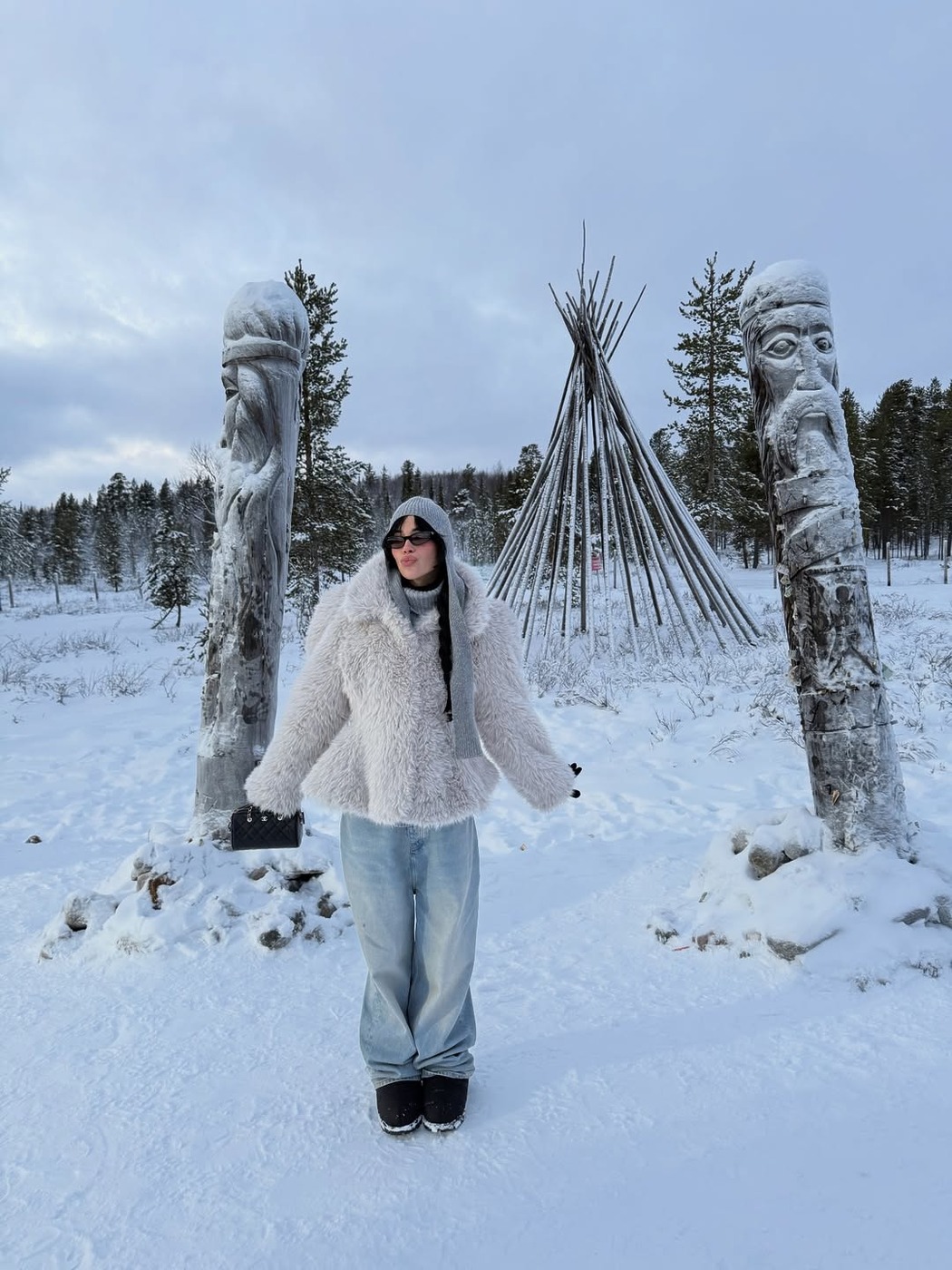 매일 입는 배기 진도 겨울 휴가 모드로 활용해보세요. 밝은 워싱 데님 팬츠에 눈밭과도 잘 어울리는 아이보리 퍼 재킷 하나만 매치하면 되는데요. 넉넉한 핏으로 실루엣을 맞춰주니 스키 리조트만의 여유로움이 자연스럽게 완성되죠. 퍼 재킷이 자칫 너무 럭셔리한 무드로 흘러가지 않게 하려면 스카프가 달린 니트 비니로 위트를 더해주세요.