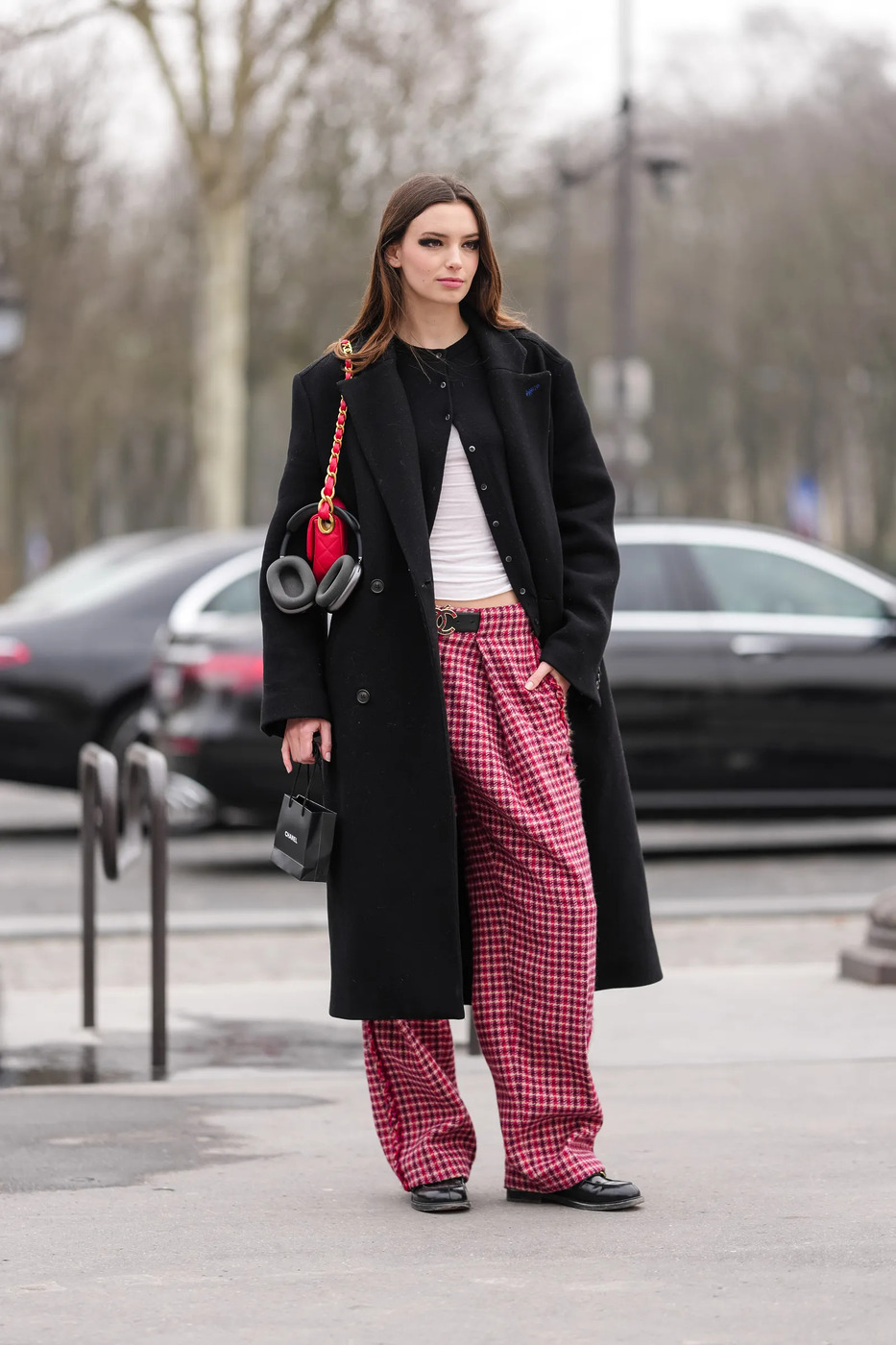 검정 코트를 활용해 과하게만 느껴지던 빨간 체크 팬츠의 존재감을 중화하는 방법도 있습니다. ‘블랙 & 레드’라는 검증이 끝난 색 조합에 기대는 거죠. 얌전한 검정 코트와 반항적인 레드 체크 팬츠가 만나며 오묘한 믹스 매치가 연출된다는 점도 빼놓을 수 없습니다. 반항기를 더하고 싶다면 컴뱃 부츠를, 정숙함을 부각하고 싶다면 로퍼를 선택하세요.