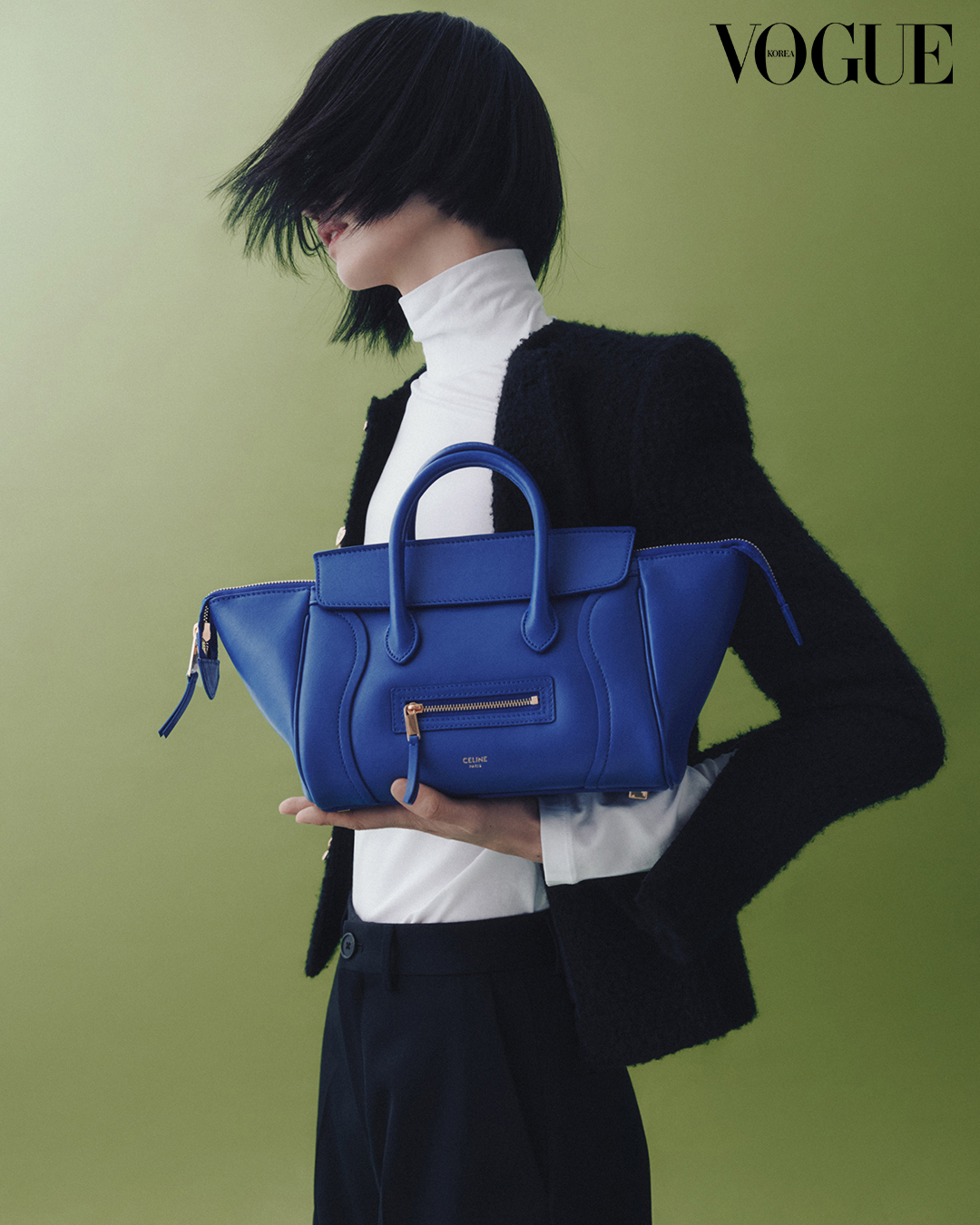 강렬한 블루 컬러, 가볍게 흐르는 스트랩 라인과 매끄러운 보디가 미니멀 룩에 볼륨감을 더한다. 블랙 캐시미어 앤 울 재킷, 블랙 도크 팬츠는 셀린느(Celine). 화이트 터틀넥 톱은 에디터 소장품.