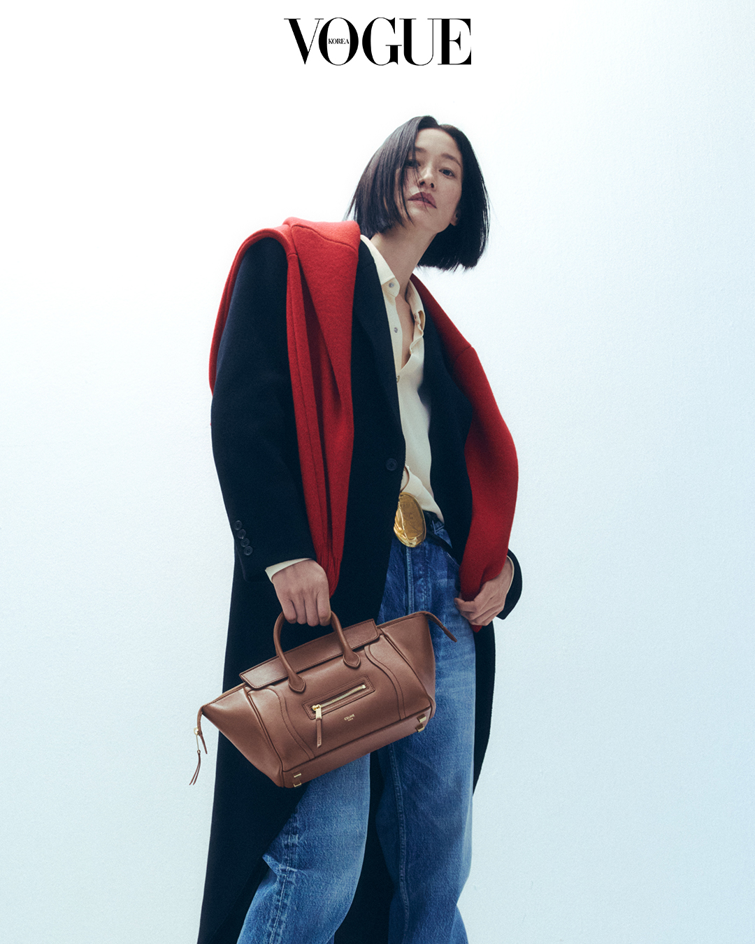 차분한 브라운 컬러에 부드러운 텍스처가 더해져 어떤 룩에도 자연스러운 실루엣을 선사한다. 블랙 테일러드 울 코트, 실크 셔츠, 어깨에 걸친 레드 캐시미어 후드 스웨터, 데님 팬츠, 로고 벨트는 셀린느(Celine).