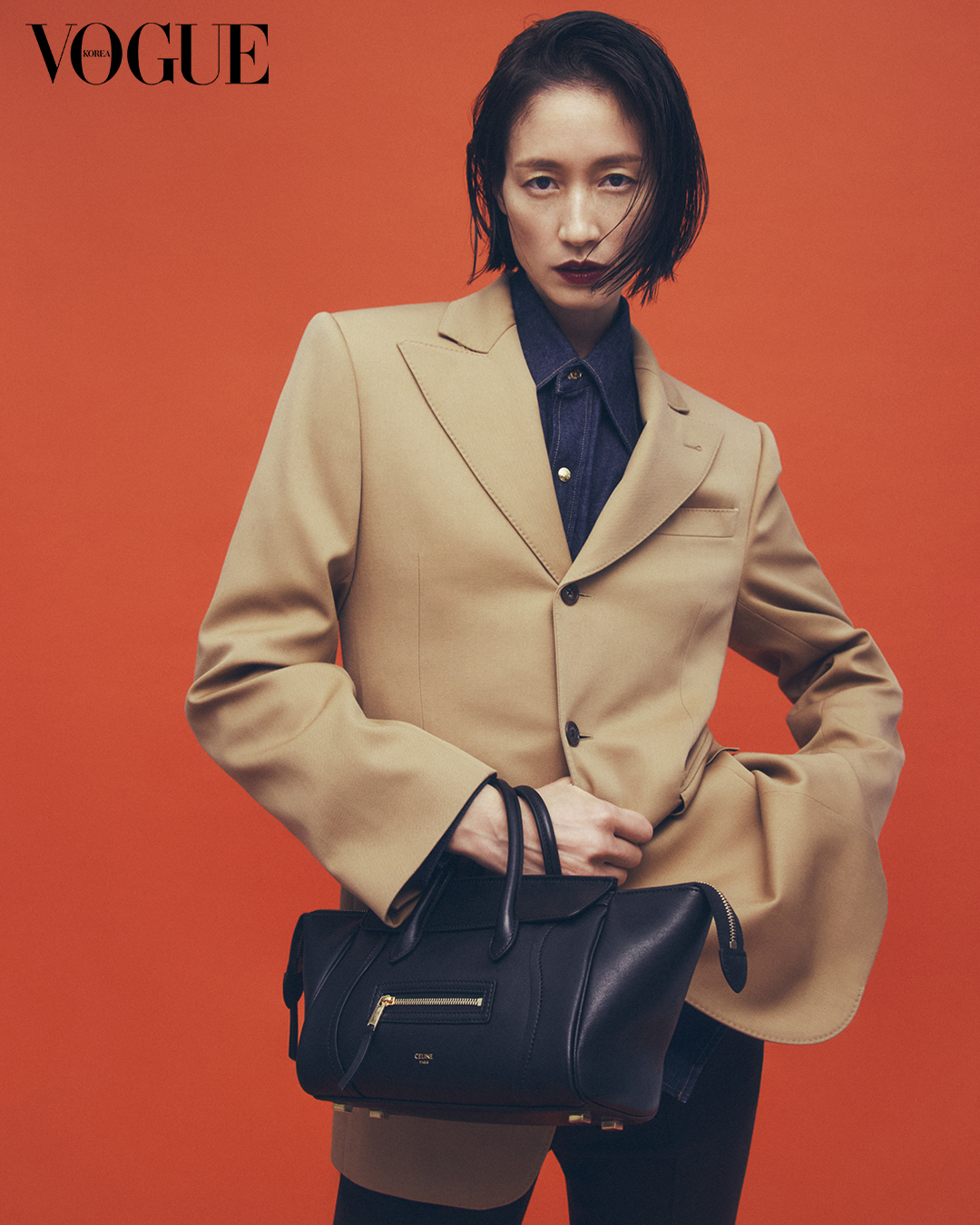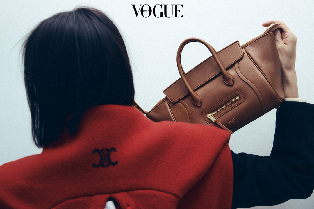 스몰 뉴 러기지 백은 셀린느의 새로운 시그니처 백으로 유연한 소재와 우아한 실루엣을 강조한다. 콜론 재킷, 데님 셔츠, 브라운 스트레치 울 팬츠는 셀린느(Celine).