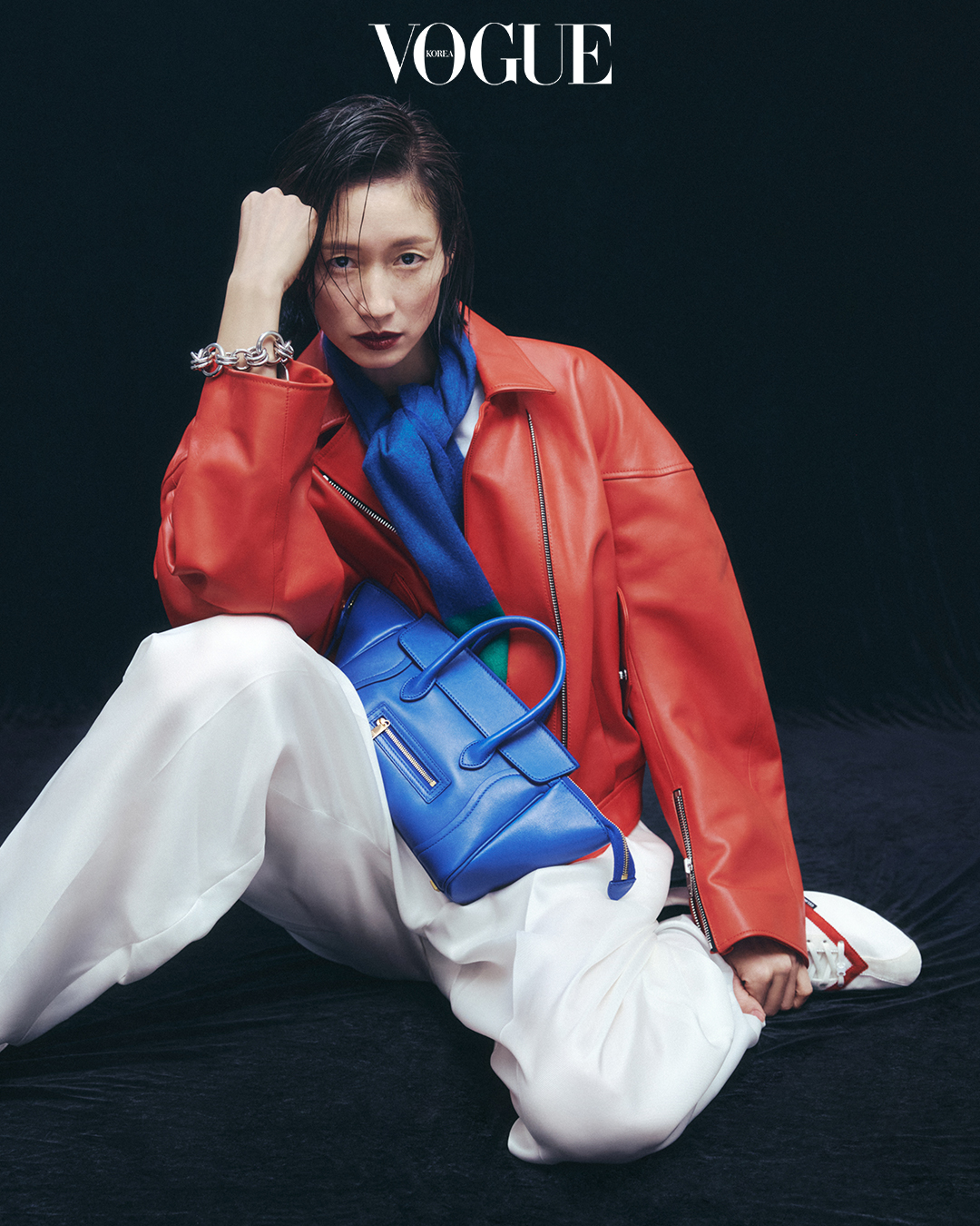 부드러운 가죽에 구조적인 실루엣을 더해 절제된 미학을 구현한 셀린느의 뉴 아이콘 백. 레드 카프스킨 재킷, 더블 레이어 티셔츠, 화이트 몬탁 팬츠, 로우 레이스업 스니커즈, 캐시미어 투톤 프린지 머플러, 참 장식 브라스 체인 브레이슬릿은 셀린느(Celine).