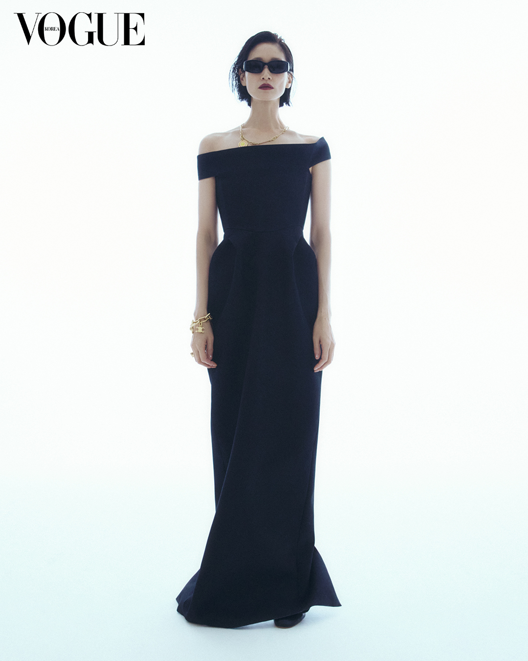 정교하게 흐르는 곡선 라인이 셀린느 특유의 절제된 미학을 드러낸다. 블랙 맥시 드레스, 저니 선글라스, 체인 네크리스, 참 장식 브라스 체인 브레이슬릿, 트리옹프 스퀘어 링은 셀린느(Celine).