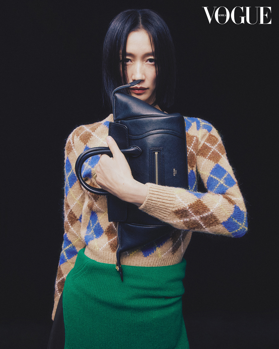 유연성과 구조미를 갖춘 정제된 스타일의 셀린느 스몰 뉴 러기지 백. 아가일 체크 크루넥 스웨터, 허리에 레이어드한 그린 캐시미어 크루넥 스웨터, 브라운 울 도크 팬츠, 트리옹프 스퀘어 링은 셀린느(Celine).