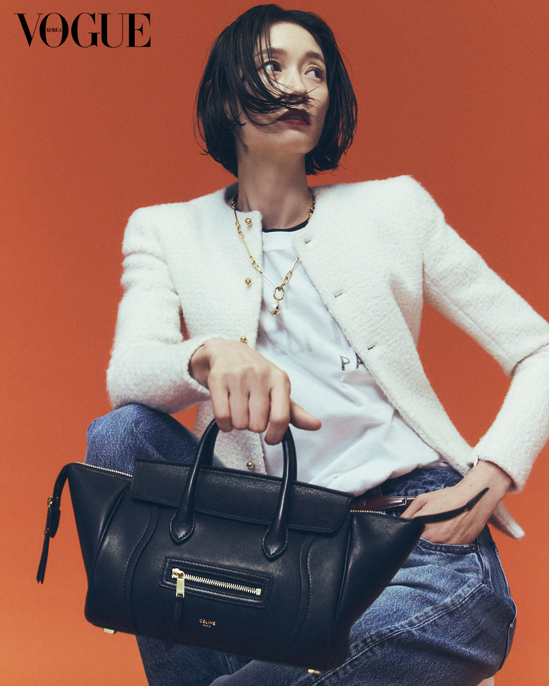군더더기 없는 디자인으로 어떤 룩에도 자연스럽게 스며드는 셀린느의 미니멀리즘을 담았다. 화이트 캐시미어 앤 울 재킷, 더블 레이어 티셔츠, 이너로 입은 블랙 레귤러 티셔츠, 데님 팬츠, 참 장식 브라스 체인 네크리스는 셀린느(Celine).