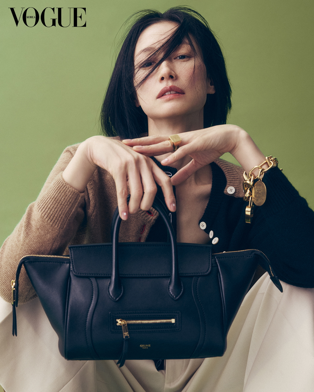 뉴 러기지 백은 세련된 컬러 구성으로 다양한 스타일링과 조화를 이룬다. 블랙 캐시미어 카디건, 레이어드한 카멜 캐시미어 카디건, 몬탁 크롭트 팬츠, 참 장식 브라스 체인 브레이슬릿, 트리옹프 스퀘어 링은 셀린느(Celine).