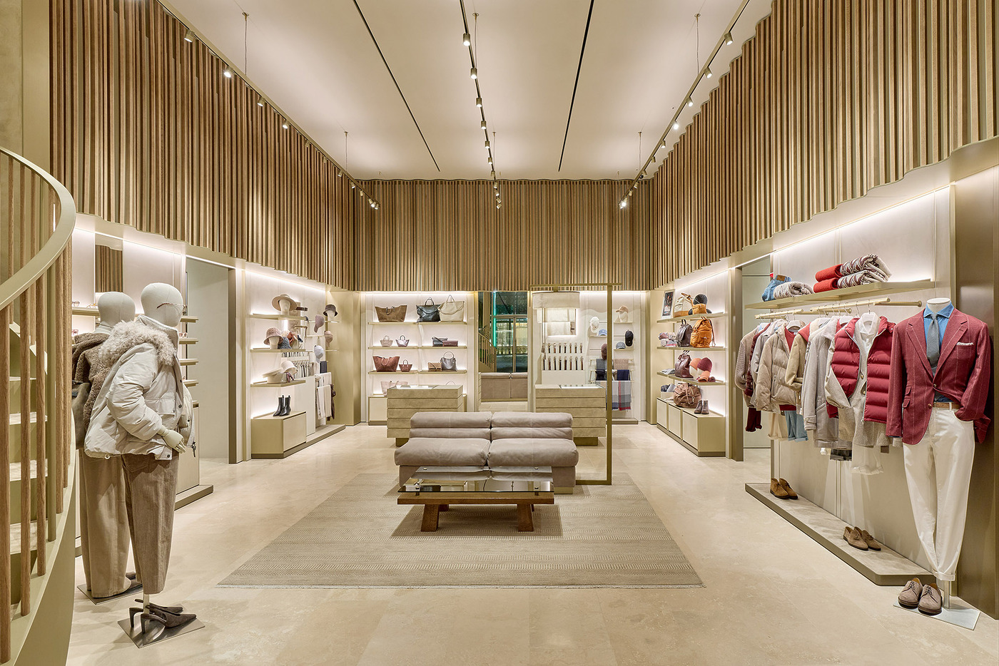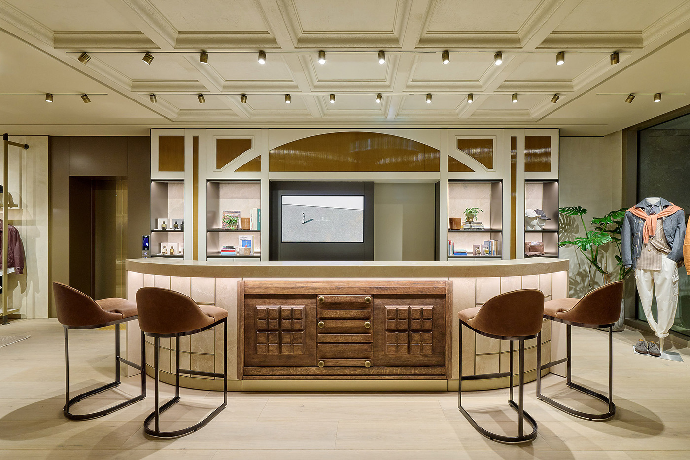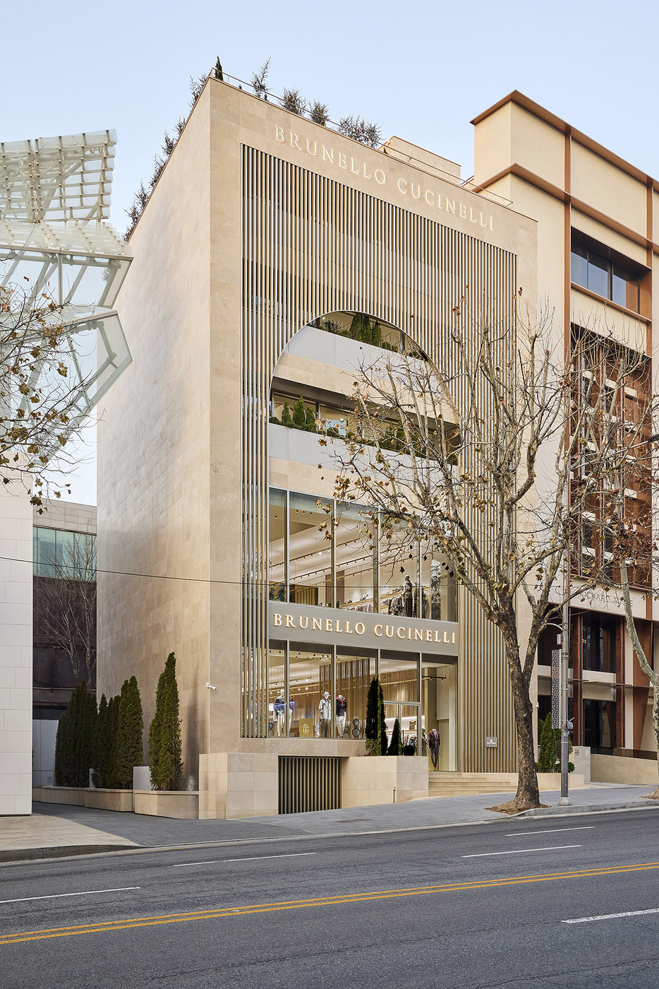 파사드는 고대 도시들이 방문객을 맞이하던 장엄한 아치에서 영감을 받았다. 브루넬로 쿠치넬리가 2014년 복원을 추진하며 다시 조명한 페루자의 2500년 된 에트루리아 문 역시 중요한 레퍼런스로 작용했다. 이른바 ‘보편적 아치’는 인간의 존엄성과 창조의 경이로움에 대한 브랜드의 신념을 시각적으로 드러내는 상징이다.