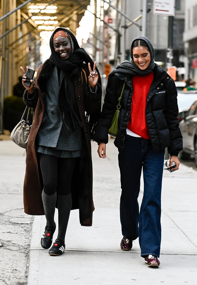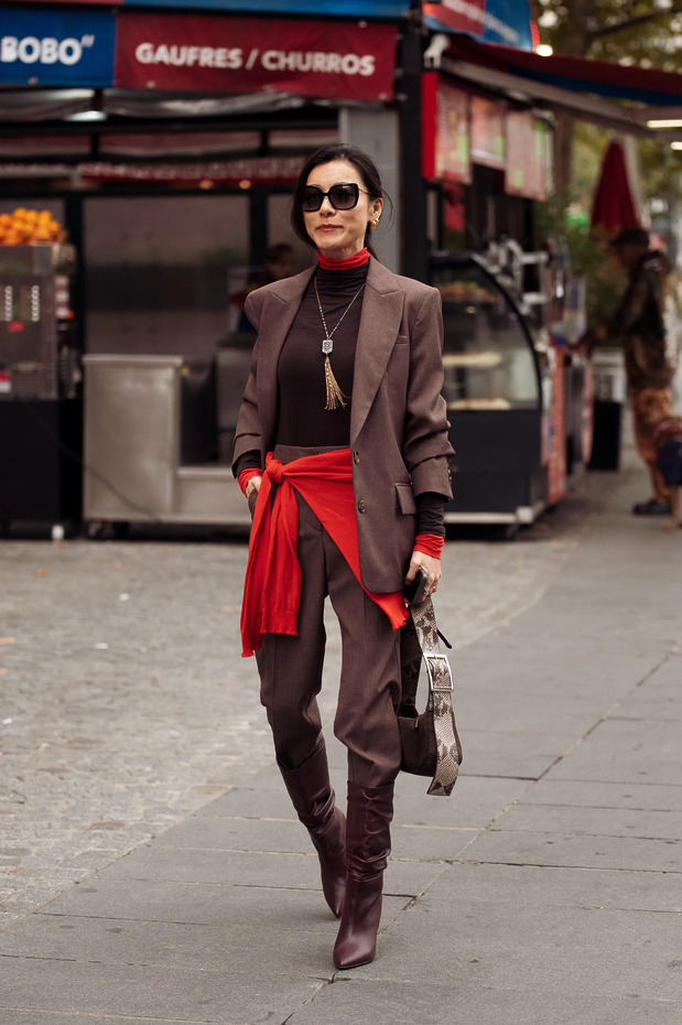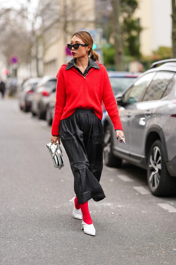 빨간 니트의 활약은 거리에서도 이어지고 있습니다. 가장 손쉬운 방법은 검정 치마나 바지와 매치하며 고혹적이면서도 클래식한 분위기를 내는 거죠. 복슬복슬한 질감이 돋보이는 오렌지색 치마를 활용한 룩 역시 돋보이는군요.