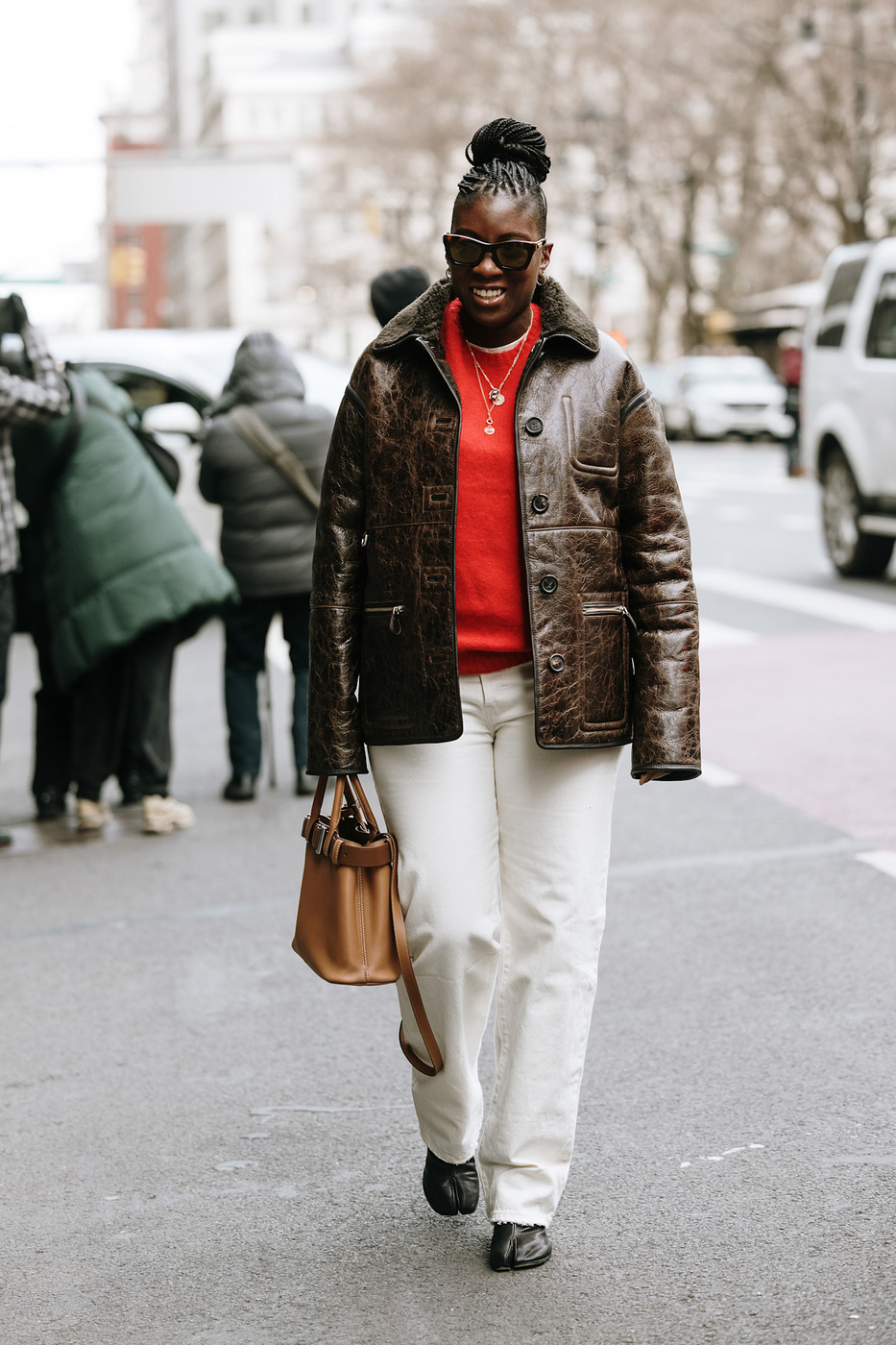 날씨가 춥다고 칙칙한 하의만 고집해야 하는 건 아니죠. ‘전복의 멋’이 느껴지는 화이트 데님도 빨간 니트와 시너지 효과를 발휘하는 아이템인데요. 복잡하게 생각할 것 없이, 청바지 위에 니트를 입은 뒤 멋스러운 시어링 재킷을 걸쳐주면 끝입니다.