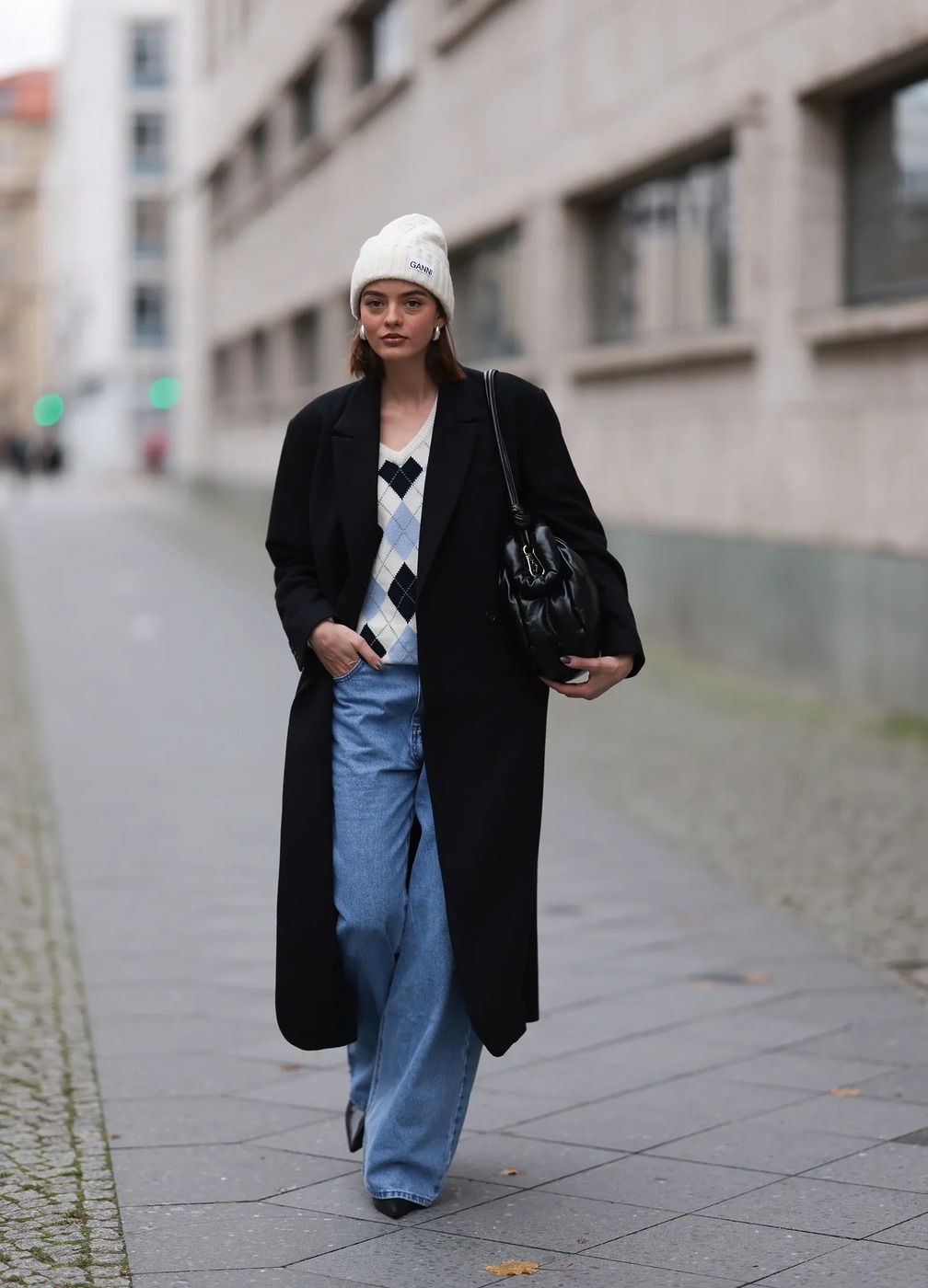 다이아몬드 패턴 스웨터를 활용하는 또 다른 방법은 크림 컬러에 쿨톤 팔레트를 구성하는 것이죠. 사진처럼 블랙 롱 코트와 레이어드하면 특유의 차가운 컬러가 쿨한 무드를 만듭니다. 1990년대에 유행한 블루 스트레이트 진과 앞코가 뾰족한 클래식 펌프스로 세련미가 배가되지만, 그 긴장감을 유연하게 풀어주는 것도 스웨터의 편안함입니다.