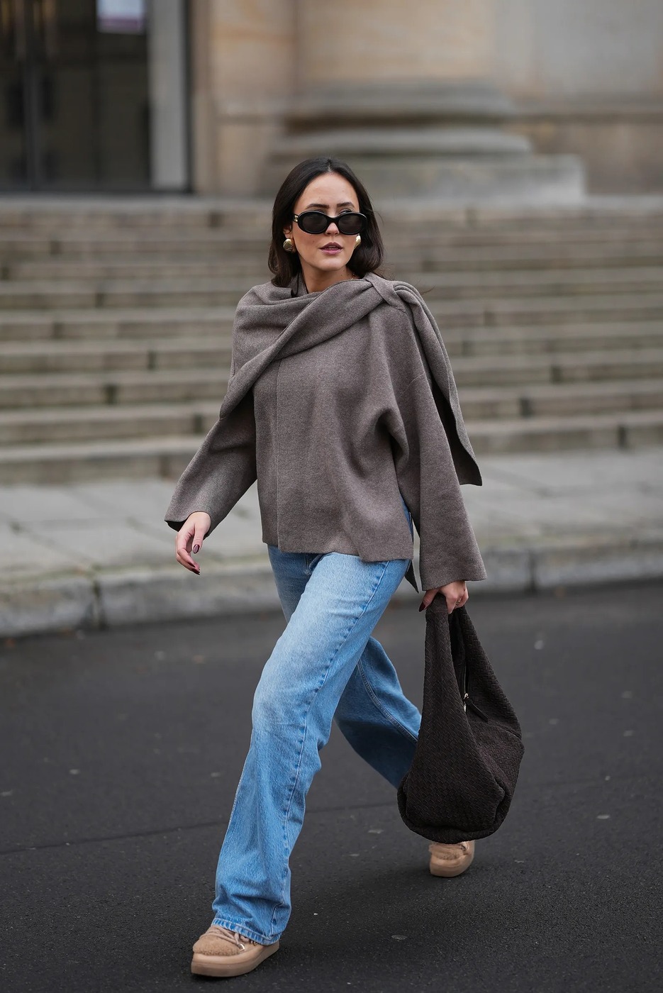 아우터로 유행했던 스카프 디테일이 스웨터까지 내려왔습니다. 어깨를 감싸는 우아함이 특별한 캐릭터를 부여하죠. 자라 같은 합리적인 브랜드에서도 쉽게 찾아볼 수 있는데요, 스트레이트 진에 앵클 부츠 같은 베이식한 룩에 더해주면 흥미로운 스타일이 완성됩니다. 고상하고 우아한 스카프 디테일이 부담스럽게 느껴진다면 사진처럼 귀여운 슈즈를 신어보세요. 어울리지 않을 법한 조합이 룩의 무거움을 상쇄해 세련되고 따뜻한 룩을 연출합니다.