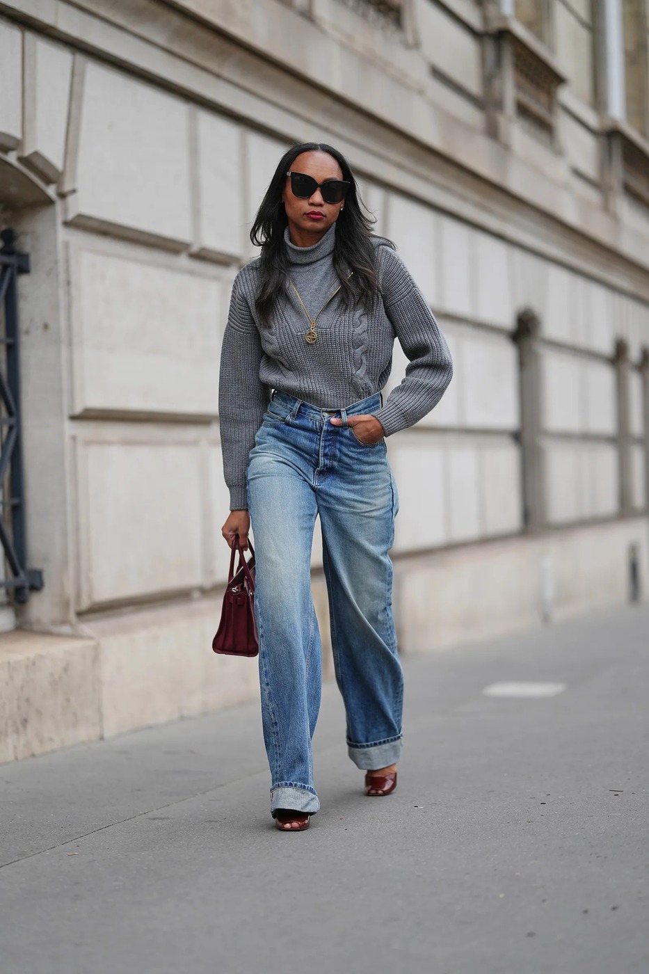 상의의 포인트는 ‘하이넥’이죠. 버버리와 디올 런웨이에서도 선보인 하이넥은 스트리트로 내려오면서 랄프 로렌식 클래식한 우아함으로 변주되었죠. 특히 하프 지퍼 디테일이 미국을 휩쓸고 있는데요, 지퍼 높낮이를 조절할 수 있으니 실용적이면서도 2020년대 시티 룩처럼 읽힙니다. 아메리칸 룩의 연장선으로 밑단을 접은 하이 웨이스트 스트레이트 진과 매치하세요. 젊은 세대라면 스웨터를 밖으로 내놓겠지만, 다리가 한 뼘이라도 길어 보이고 싶다면 바지 안으로 넣어보세요. 어떤 식이든 멋진 스타일이 됩니다.